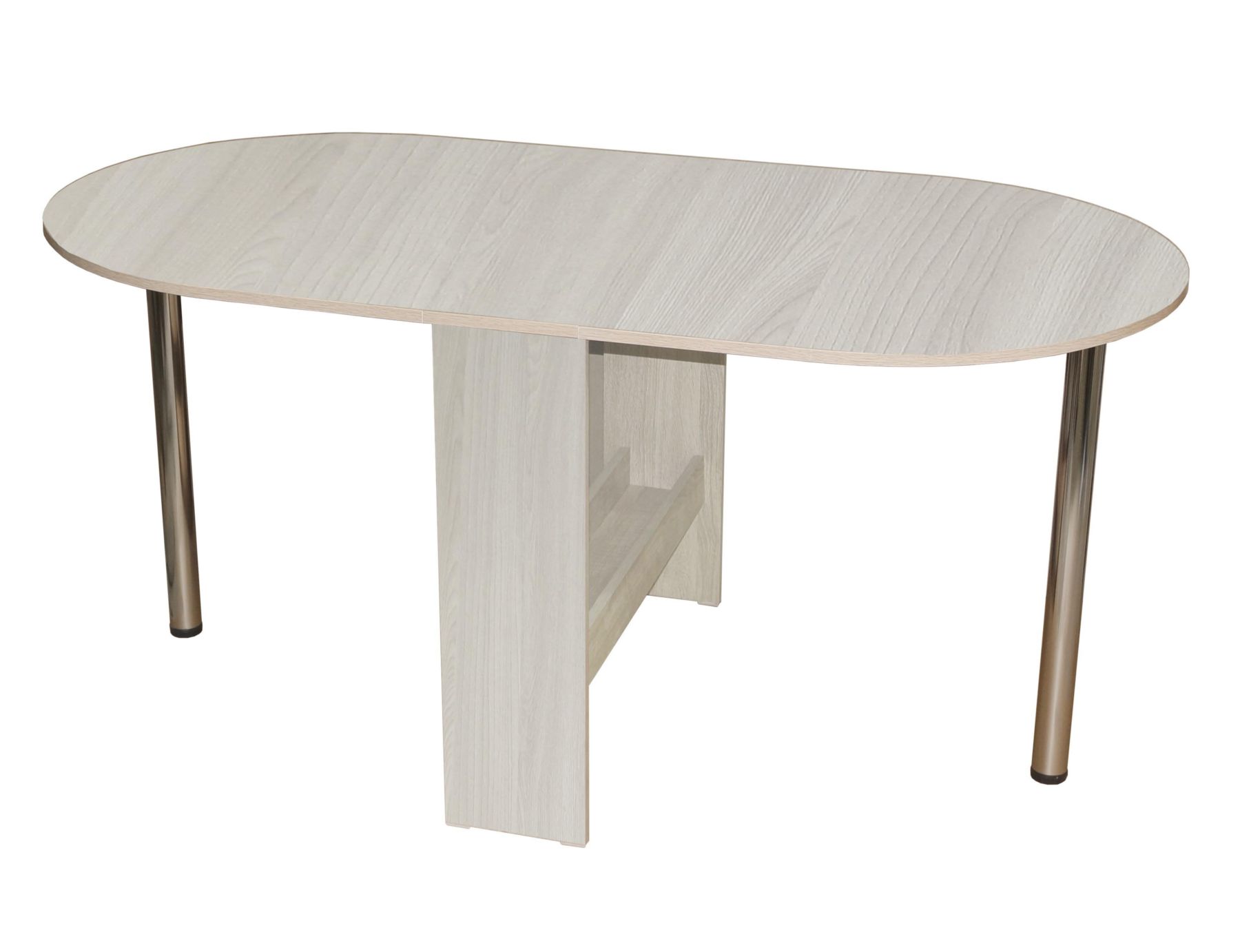 Стол изготовлен из ЛДСП высокого качества. Толщина столешницы 16 мм. Стол раскладной с использованием карточной петли. Ножки круглые хромированные диаметром 50 мм.
