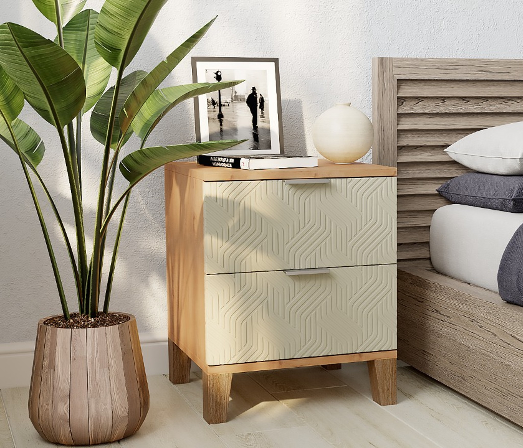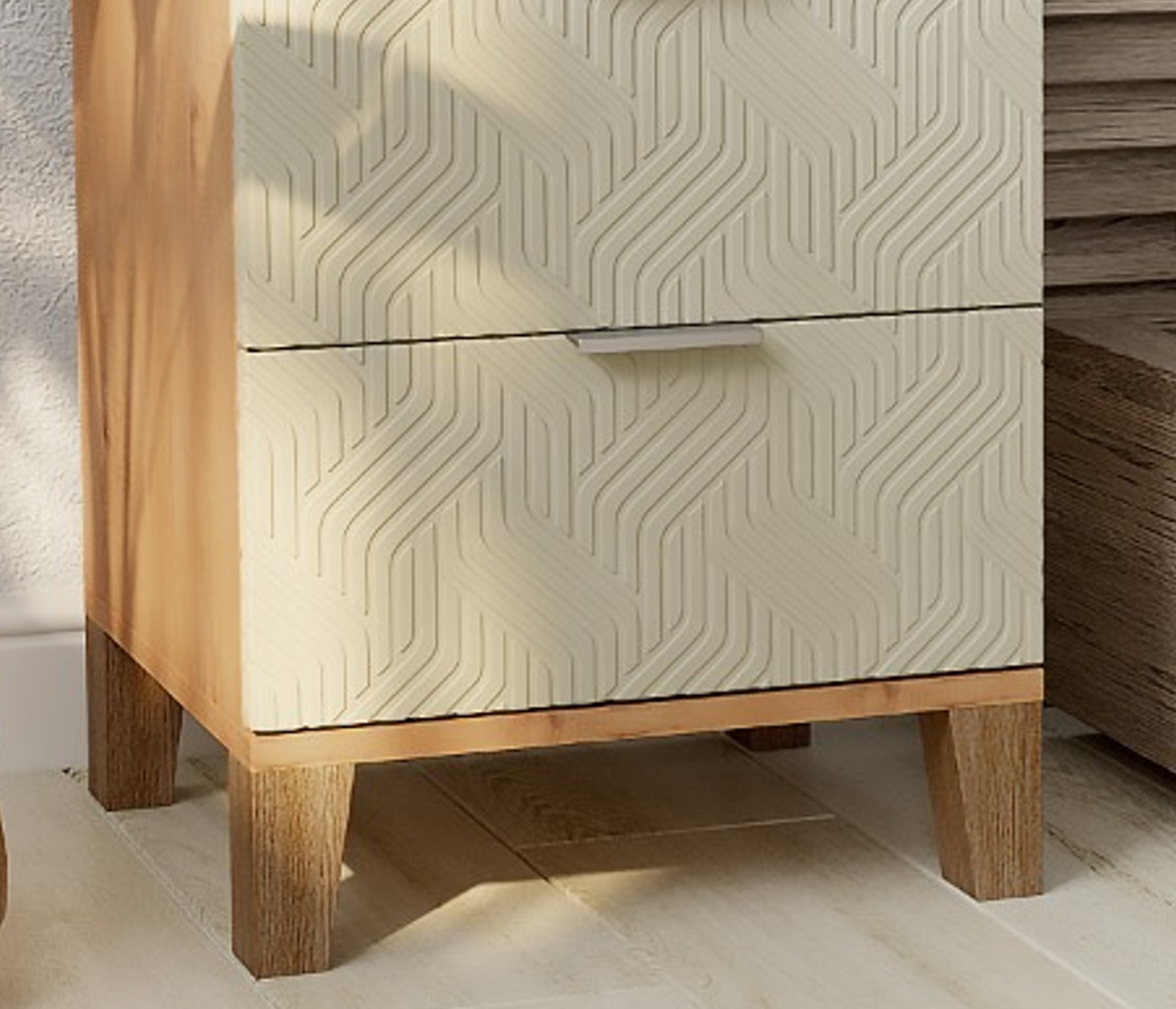 Тумба прикроватная Йорк выполнена в скандинавском стиле, органично дополняет интерьер любой комнаты. Геометрическая фрезеровка на фасадах, сочетание цветов - отличительная черта данной серии.