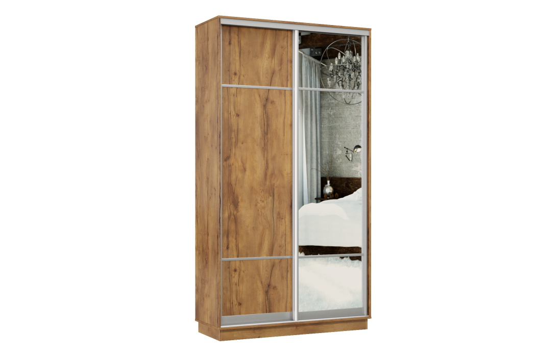 Один фасад выполнен из ЛДСП с разъединительным профилем, а другой – зеркало с разъединительным профилем. Используется выдвижная штанга для одежды.