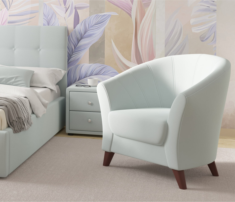 Мягкое интерьерное кресло может быть выполнено в различных цветовых вариантах из высокопрочного мебельного материала – микровелюр. Это уникальный материал, который получается за счет сплетения пяти волокон одновременно. Ткань износостойкая, легко чиститься от загрязнений, практичная, эластичная, устойчивая к ультрафиолету.