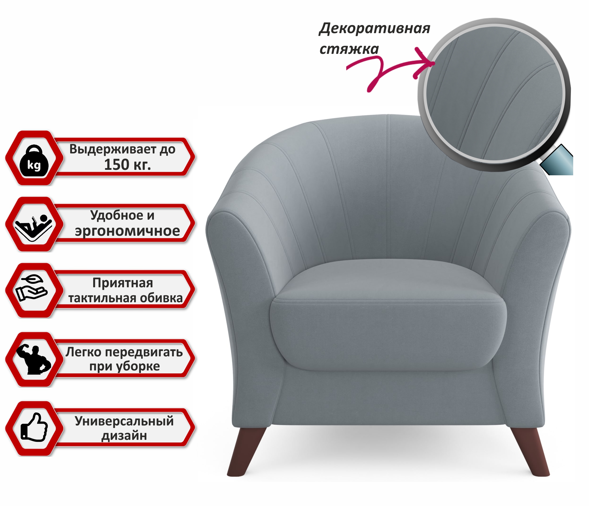 Мягкое интерьерное кресло может быть выполнено в различных цветовых вариантах из высокопрочного мебельного материала – микровелюр. Это уникальный материал, который получается за счет сплетения пяти волокон одновременно. Ткань износостойкая, легко чиститься от загрязнений, практичная, эластичная, устойчивая к ультрафиолету.