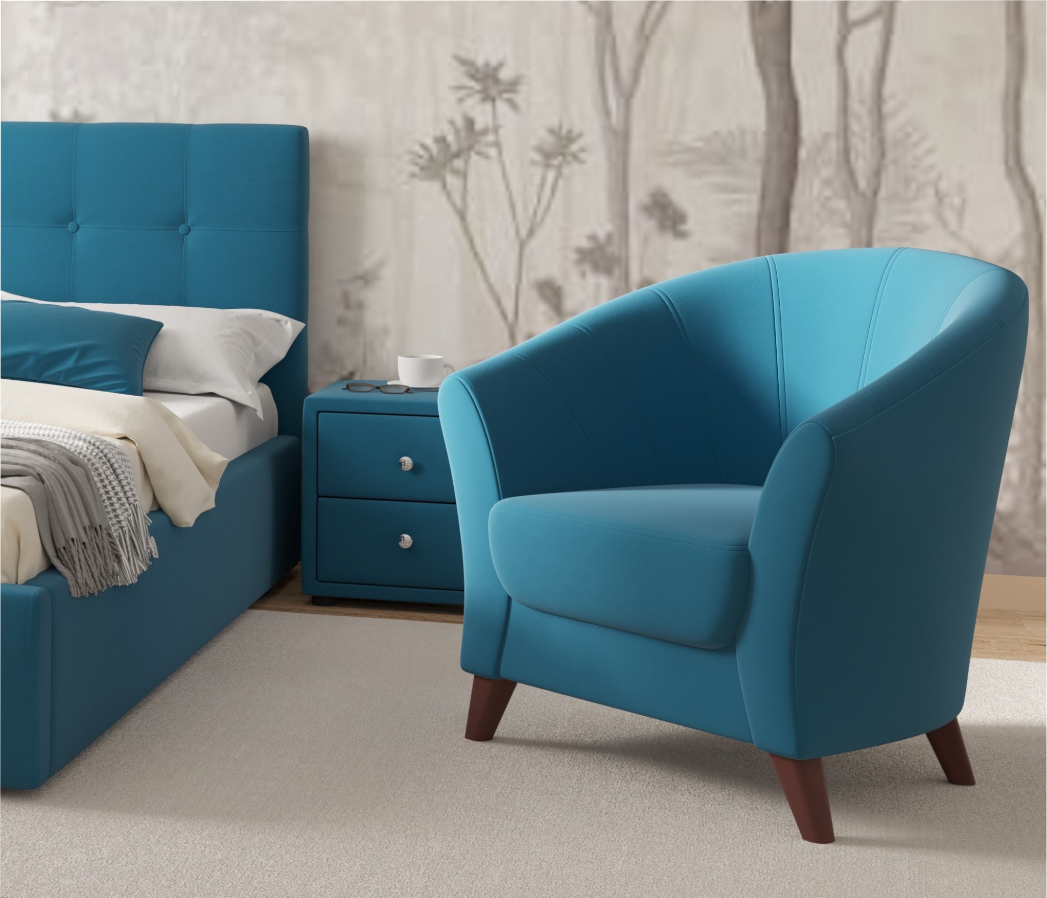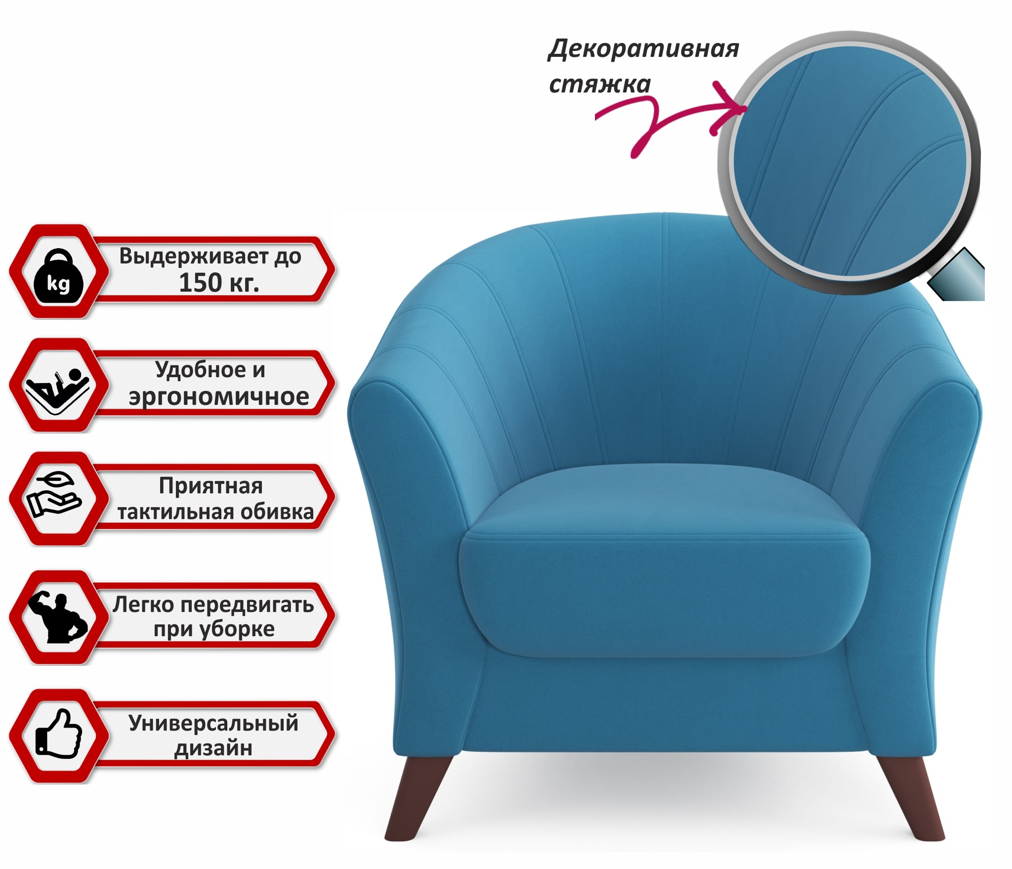 Мягкое интерьерное кресло может быть выполнено в различных цветовых вариантах из высокопрочного мебельного материала – микровелюр. Это уникальный материал, который получается за счет сплетения пяти волокон одновременно. Ткань износостойкая, легко чиститься от загрязнений, практичная, эластичная, устойчивая к ультрафиолету.