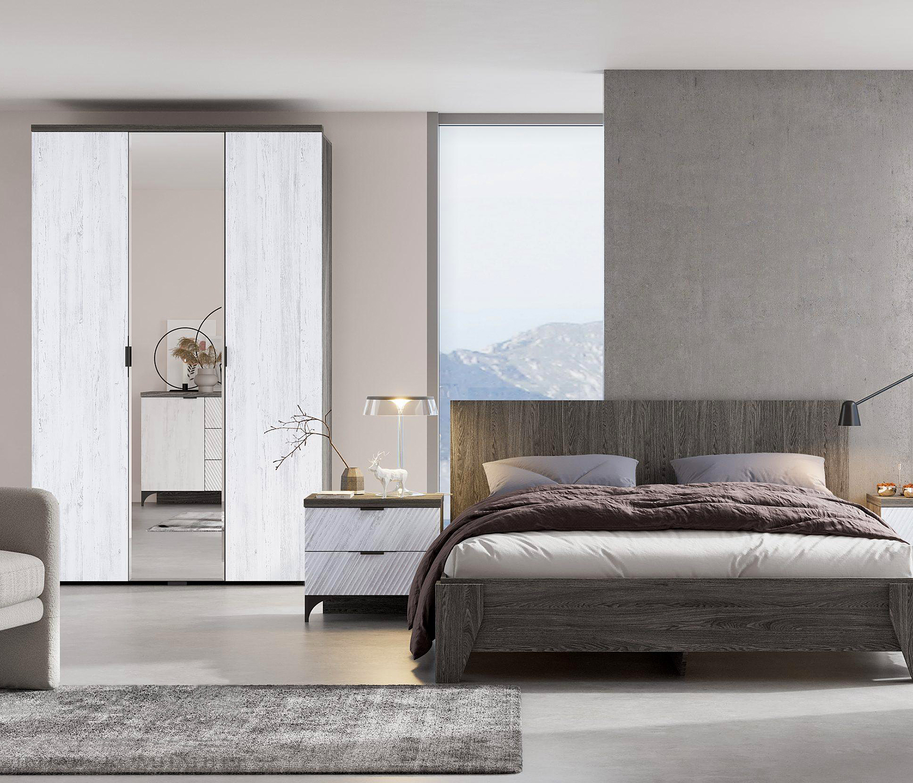 Новые современные цвета: черный ясень — это глубокий серый, легкий и одновременно динамичный цвет в сочетании с санторини белым — цвет с древесными линиями, создающими гармоничный контраст, наполняя пространство воздухом и природной энергией.