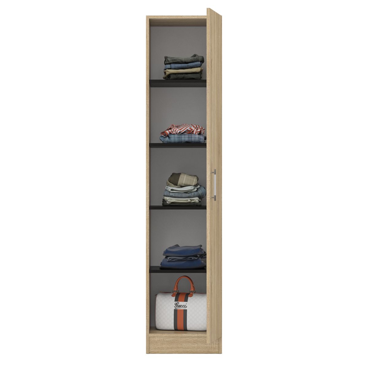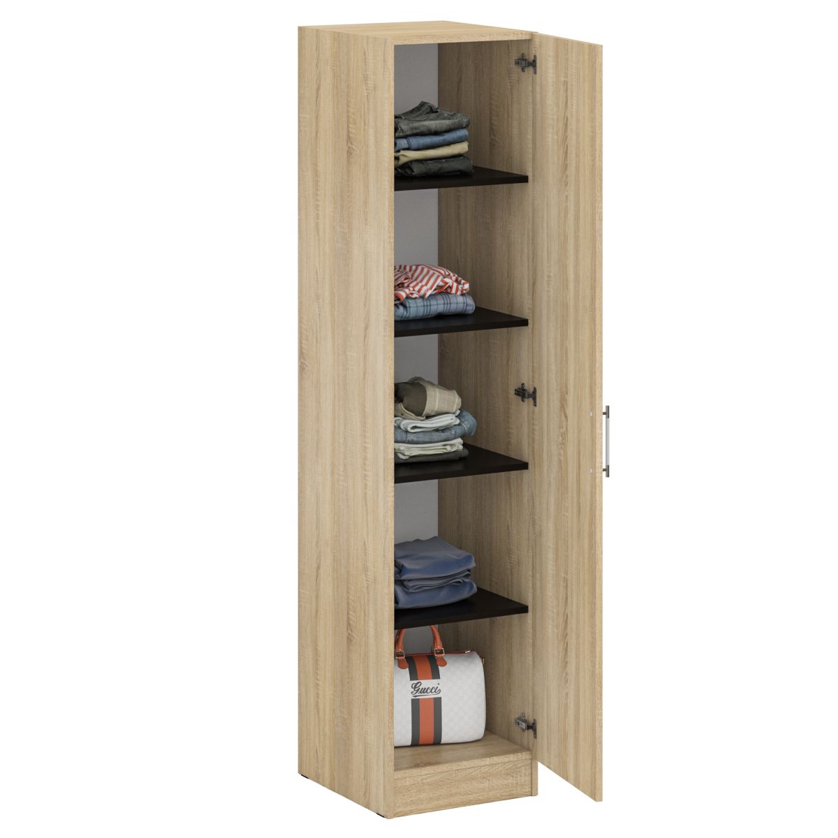 Функциональность, компактность и простота формы - три слагаемые дизайнерской идеи спальни Стандарт. Классическая геометрия и спокойный природный тон пенала Стандарт поддержат базовый интерьер, легко сочетаясь с мебелью любого стиля. Высокий шкаф-пенал, за распашной дверкой которого расположены четыре съёмные полки. Универсальная дверь - сторону открывания двери Вы определятете при сборке. В комнату с такой нейтральной обстановкой легко добавить индивидуальности, расставив акценты с помощью креативных аксессуаров. Пенал Стандарт поможет создать универсальный интерьер, который будет жить вне времени и моды, без необходимости обновления. Элегантная простота и эргономичность серии Стандарт, в сочетании с идеальным качеством исполнения, обещают удовольствие на долгие годы. Пенал Стандарт выполнена из экологически чистой ламинированной ДСП с классом эмиссии Е1, допустимым для детской мебели. В производстве использованы фурнитура высоких стандартов и обработка деталей противоударной кромкой ПХВ. Поставляется пенал Стандарт в разобранном виде в надёжной упаковке, с комплектом фурнитуры и инструкцией по сборке. Вы можете купить пенал Стандарт со скидкой при заказе через сайт в нашем магазине. Изображения пенала Стандарт Вы можете найти выше в начале страницы.