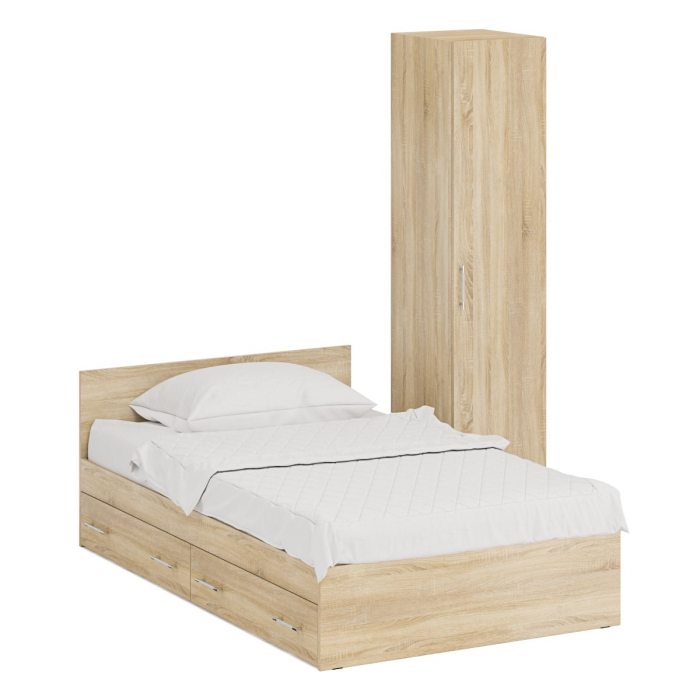 Комплект состоит из односпальной с ящиками кровати и пенала. Функциональность, компактность и простота формы - три слагаемые дизайнерской идеи кровати Стандарт. Классическая геометрия и спокойный природный тон кровати поддержат базовый интерьер, легко сочетаясь с мебелью любого стиля. В комнату с такой нейтральной обстановкой легко добавить индивидуальности, расставив акценты с помощью креативных аксессуаров. Односпальная кровать с ящиками 1200 Стандарт - надёжная, с устойчивым основанием и удобной спинкой, идеально подходит для детской комнаты. Сп.м. 1200х2000 мм, основание в комплекте (настил ДСП), матрас 1200х2000 мм. приобретается отдельно. В основании кровати расположены два вместительных ящика для хранения постельных принадлежностей и личных вещей. Определённый интерес мебель Стандарт представляет и для обустройства гостиничных номеров, пансионатов, детских лагерей. Высокий шкаф-пенал, за распашной дверкой которого расположены четыре съёмные полки. Универсальная дверь - сторону открывания двери Вы определятете при сборке. Односпальная кровать с ящиками 1200 с пеналом Стандарт поможет создать универсальный интерьер, который будет жить вне времени и моды, без необходимости обновления. Элегантная простота и эргономичность кровати, в сочетании с идеальным качеством исполнения, обещают удовольствие на долгие годы. Односпальная кровать с ящиками 1200 с пеналом Стандарт выполнены из экологически чистой ламинированной ДСП с классом эмиссии Е1, допустимым для детской мебели. В производстве мебели использована фурнитура высоких стандартов и обработка деталей противоударной кромкой ПХВ. Поставляется мебель в разобранном виде в надёжной упаковке, с комплектом фурнитуры и инструкцией по сборке.