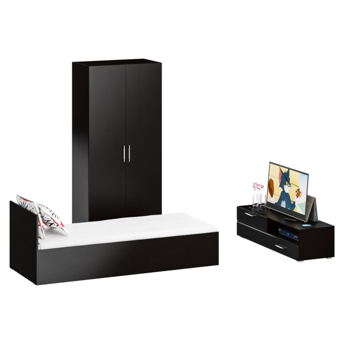 Спальня Стандарт № 3 состоит из односпальной кровати, шкафа 2-х створчатого и тумбы под ТВ. Функциональность, компактность и простота формы - три слагаемые дизайнерской идеи спален Стандарт. Классическая геометрия и спокойный природный тон мебели Стандарт поддержат базовый интерьер, легко сочетаясь с мебелью любого стиля. В комнату с такой нейтральной обстановкой легко добавить индивидуальности, расставив акценты с помощью креативных аксессуаров. Кровать Стандарт - надёжная, с устойчивым основанием и удобной спинкой, идеально подходит для детской комнаты. Сп.м. 800х2000 мм, основание в комплекте (настил ДСП), матрас 800х2000 мм. приобретается отдельно. Определённый интерес мебель Стандарт представляет и для обустройства гостиничных номеров, пансионатов, детских лагерей. За распашными дверками шкафа для одежды расположены отделение со штангой для одежды на плечиках и антресольной полкой с одной стороны, и нишей с тремя полками с другой. Тумба под ТВ придётся по вкусу любителям стильных элементов мебели в оформлении интерьера. Особый акцент данной модели - глянцевое покрытие фасадов, выполненных из МДФ 16 мм. с торцевой фрезеровкой в виде фацета и геометрической фрезеровкой откидной дверки. Линейный декор тумбы подчёркнут ручками-рейлингами, имеющих сочетанное хромированно-матовое покрытие. Конструктивно тумба разделена на два одинаковой ширины отделения. Слева расположена закрытая откидной дверкой ниша, справа - открытая ниша и выдвижной ящик. Установлена тумба на плоские, прочные и надёжные прямоугольные ножки. Пластиковые накладки на ножках защитят Ваше напольное покрытие от механических повреждений. Спальня Стандарт № 3 имеет универсальный интерьер, который будет жить вне времени и моды, без необходимости обновления. Элегантная простота и эргономичность кровати, в сочетании с идеальным качеством исполнения, обещают удовольствие на долгие годы. Спальня Стандарт № 3 выполнен из экологически чистой ламинированной ДСП с классом эмиссии Е1, допустимым для детской мебели. В производстве мебели использована фурнитура высоких стандартов и обработка деталей противоударной кромкой ПХВ. Поставляется мебель в разобранном виде в надёжной упаковке, с комплектом фурнитуры и инструкцией по сборке.