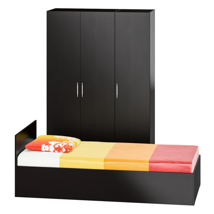 Спальный гарнитур № 1 состоит из односпальной кровати, 2-х створчатого шкафа для одежды и пенала, объединенных в единый блок. Функциональность, компактность и простота формы - три слагаемые дизайнерской идеи спален Стандарт. Классическая геометрия и спокойный природный тон мебели Стандарт поддержат базовый интерьер, легко сочетаясь с мебелью любого стиля. В комнату с такой нейтральной обстановкой легко добавить индивидуальности, расставив акценты с помощью креативных аксессуаров. Кровать Стандарт - надёжная, с устойчивым основанием и удобной спинкой, идеально подходит для детской комнаты. Сп.м. 900х2000 мм, основание в комплекте (настил ДСП), матрас 900х2000 мм. приобретается отдельно. Определённый интерес мебель Стандарт представляет и для обустройства гостиничных номеров, пансионатов, детских лагерей. За распашными дверками шкафа для одежды расположены отделение со штангой для одежды на плечиках и антресольной полкой с одной стороны, и нишей с тремя полками с другой. Высокий пенал, за распашной дверкой которого расположены четыре съёмные полки. Универсальная дверь - сторону открывания двери Вы определятете при сборке. Спальный гарнитур № 1 имеет универсальный интерьер, который будет жить вне времени и моды, без необходимости обновления. Элегантная простота и эргономичность кровати, в сочетании с идеальным качеством исполнения, обещают удовольствие на долгие годы. Спальный гарнитур № 1 выполнен из экологически чистой ламинированной ДСП с классом эмиссии Е1, допустимым для детской мебели. В производстве мебели использована фурнитура высоких стандартов и обработка деталей противоударной кромкой ПХВ. Поставляется мебель в разобранном виде в надёжной упаковке, с комплектом фурнитуры и инструкцией по сборке.