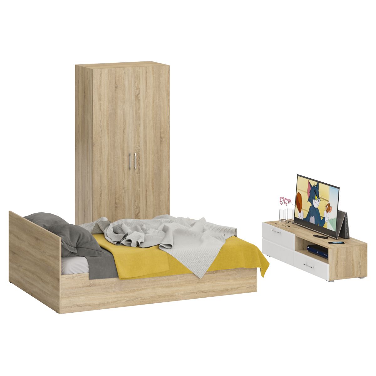 Спальня Стандарт № 3 состоит из двухспальной кровати, шкафа 2-х створчатого и тумбы под ТВ. Функциональность, компактность и простота формы - три слагаемые дизайнерской идеи спален Стандарт. Классическая геометрия и спокойный природный тон мебели Стандарт поддержат базовый интерьер, легко сочетаясь с мебелью любого стиля. В комнату с такой нейтральной обстановкой легко добавить индивидуальности, расставив акценты с помощью креативных аксессуаров. Кровать Стандарт - надёжная, с устойчивым основанием и удобной спинкой, идеально подходит для детской комнаты. Сп.м. 1400х2000 мм, основание в комплекте (настил ДСП), матрас 1400х2000 мм. приобретается отдельно. Определённый интерес мебель Стандарт представляет и для обустройства гостиничных номеров, пансионатов, детских лагерей. За распашными дверками шкафа для одежды расположены отделение со штангой для одежды на плечиках и антресольной полкой с одной стороны, и нишей с тремя полками с другой. Тумба под ТВ придётся по вкусу любителям стильных элементов мебели в оформлении интерьера. Особый акцент данной модели - глянцевое покрытие фасадов, выполненных из МДФ 16 мм. с торцевой фрезеровкой в виде фацета и геометрической фрезеровкой откидной дверки. Линейный декор тумбы подчёркнут ручками-рейлингами, имеющих сочетанное хромированно-матовое покрытие. Конструктивно тумба разделена на два одинаковой ширины отделения. Слева расположена закрытая откидной дверкой ниша, справа - открытая ниша и выдвижной ящик. Установлена тумба на плоские, прочные и надёжные прямоугольные ножки. Пластиковые накладки на ножках защитят Ваше напольное покрытие от механических повреждений. Спальня Стандарт № 3 имеет универсальный интерьер, который будет жить вне времени и моды, без необходимости обновления. Элегантная простота и эргономичность кровати, в сочетании с идеальным качеством исполнения, обещают удовольствие на долгие годы. Спальня Стандарт № 3 выполнен из экологически чистой ламинированной ДСП с классом эмиссии Е1, допустимым для детской мебели. В производстве мебели использована фурнитура высоких стандартов и обработка деталей противоударной кромкой ПХВ. Поставляется мебель в разобранном виде в надёжной упаковке, с комплектом фурнитуры и инструкцией по сборке.