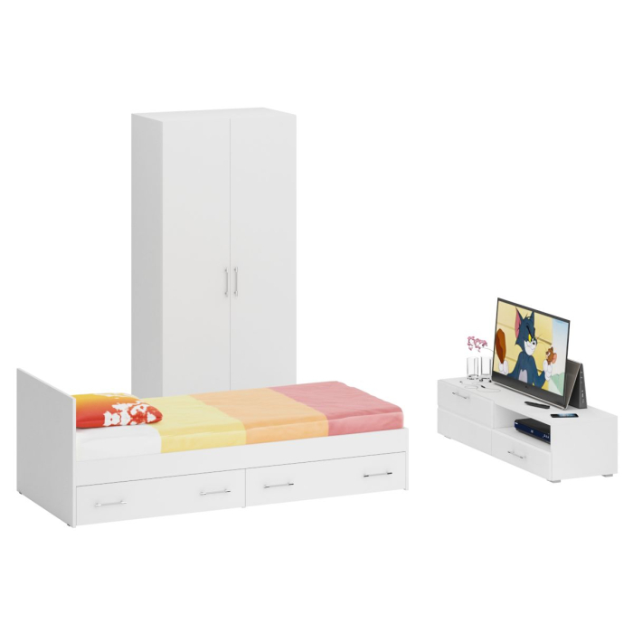 Спальня Стандарт № 3 состоит из односпальной кровати, шкафа 2-х створчатого и тумбы под ТВ. Функциональность, компактность и простота формы - три слагаемые дизайнерской идеи спален Стандарт. Классическая геометрия и спокойный природный тон мебели Стандарт поддержат базовый интерьер, легко сочетаясь с мебелью любого стиля. В комнату с такой нейтральной обстановкой легко добавить индивидуальности, расставив акценты с помощью креативных аксессуаров. Кровать Стандарт - надёжная, с устойчивым основанием и удобной спинкой, идеально подходит для детской комнаты. Сп.м. 900х2000 мм, основание в комплекте (настил ДСП), матрас 900х2000 мм. приобретается отдельно. В основании кровати расположены два вместительных ящика для хранения постельных принадлежностей и личных вещей. Определённый интерес мебель Стандарт представляет и для обустройства гостиничных номеров, пансионатов, детских лагерей. За распашными дверками шкафа для одежды расположены отделение со штангой для одежды на плечиках и антресольной полкой с одной стороны, и нишей с тремя полками с другой. Тумба под ТВ придётся по вкусу любителям стильных элементов мебели в оформлении интерьера. Особый акцент данной модели - глянцевое покрытие фасадов, выполненных из МДФ 16 мм. с торцевой фрезеровкой в виде фацета и геометрической фрезеровкой откидной дверки. Линейный декор тумбы подчёркнут ручками-рейлингами, имеющих сочетанное хромированно-матовое покрытие. Конструктивно тумба разделена на два одинаковой ширины отделения. Слева расположена закрытая откидной дверкой ниша, справа - открытая ниша и выдвижной ящик. Установлена тумба на плоские, прочные и надёжные прямоугольные ножки. Пластиковые накладки на ножках защитят Ваше напольное покрытие от механических повреждений. Спальня Стандарт № 3 имеет универсальный интерьер, который будет жить вне времени и моды, без необходимости обновления. Элегантная простота и эргономичность кровати, в сочетании с идеальным качеством исполнения, обещают удовольствие на долгие годы. Спальня Стандарт № 3 выполнен из экологически чистой ламинированной ДСП с классом эмиссии Е1, допустимым для детской мебели. В производстве мебели использована фурнитура высоких стандартов и обработка деталей противоударной кромкой ПХВ. Поставляется мебель в разобранном виде в надёжной упаковке, с комплектом фурнитуры и инструкцией по сборке.