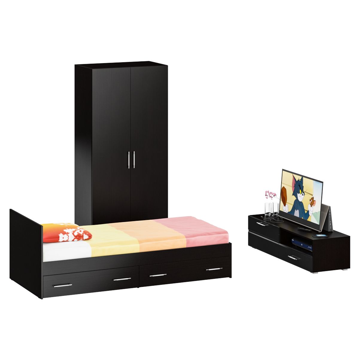 Спальня Стандарт № 3 состоит из односпальной кровати, шкафа 2-х створчатого и тумбы под ТВ. Функциональность, компактность и простота формы - три слагаемые дизайнерской идеи спален Стандарт. Классическая геометрия и спокойный природный тон мебели Стандарт поддержат базовый интерьер, легко сочетаясь с мебелью любого стиля. В комнату с такой нейтральной обстановкой легко добавить индивидуальности, расставив акценты с помощью креативных аксессуаров. Кровать Стандарт - надёжная, с устойчивым основанием и удобной спинкой, идеально подходит для детской комнаты. Сп.м. 900х2000 мм, основание в комплекте (настил ДСП), матрас 900х2000 мм. приобретается отдельно. В основании кровати расположены два вместительных ящика для хранения постельных принадлежностей и личных вещей. Определённый интерес мебель Стандарт представляет и для обустройства гостиничных номеров, пансионатов, детских лагерей. За распашными дверками шкафа для одежды расположены отделение со штангой для одежды на плечиках и антресольной полкой с одной стороны, и нишей с тремя полками с другой. Тумба под ТВ придётся по вкусу любителям стильных элементов мебели в оформлении интерьера. Особый акцент данной модели - глянцевое покрытие фасадов, выполненных из МДФ 16 мм. с торцевой фрезеровкой в виде фацета и геометрической фрезеровкой откидной дверки. Линейный декор тумбы подчёркнут ручками-рейлингами, имеющих сочетанное хромированно-матовое покрытие. Конструктивно тумба разделена на два одинаковой ширины отделения. Слева расположена закрытая откидной дверкой ниша, справа - открытая ниша и выдвижной ящик. Установлена тумба на плоские, прочные и надёжные прямоугольные ножки. Пластиковые накладки на ножках защитят Ваше напольное покрытие от механических повреждений. Спальня Стандарт № 3 имеет универсальный интерьер, который будет жить вне времени и моды, без необходимости обновления. Элегантная простота и эргономичность кровати, в сочетании с идеальным качеством исполнения, обещают удовольствие на долгие годы. Спальня Стандарт № 3 выполнен из экологически чистой ламинированной ДСП с классом эмиссии Е1, допустимым для детской мебели. В производстве мебели использована фурнитура высоких стандартов и обработка деталей противоударной кромкой ПХВ. Поставляется мебель в разобранном виде в надёжной упаковке, с комплектом фурнитуры и инструкцией по сборке.
