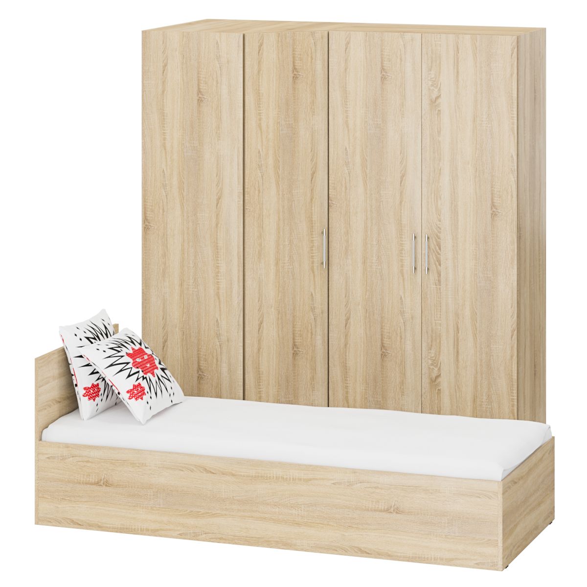 Гарнитур Спальный № 2 состоит из односпальной кровати и двух шкафов объединенных в единый блок - 2-х створчатого и углового. Функциональность, компактность и простота формы - три слагаемые дизайнерской идеи спален Стандарт. Классическая геометрия и спокойный природный тон мебели Стандарт поддержат базовый интерьер, легко сочетаясь с мебелью любого стиля. В комнату с такой нейтральной обстановкой легко добавить индивидуальности, расставив акценты с помощью креативных аксессуаров. Кровать Стандарт - надёжная, с устойчивым основанием и удобной спинкой, идеально подходит для детской комнаты. Сп.м. 800х2000 мм, основание в комплекте (настил ДСП), матрас 800х2000 мм. приобретается отдельно. Определённый интерес мебель Стандарт представляет и для обустройства гостиничных номеров, пансионатов, детских лагерей. За распашными дверками шкафа для одежды расположены отделение со штангой для одежды на плечиках и антресольной полкой с одной стороны, и нишей с тремя полками с другой. За распашной дверкой шкафа углового расположены два отделения - со штангой для одежды на плечиках и антресольной полкой с одной стороны, и нишей с тремя полками с другой. Универсальная сборка - сторону открывания двери и располажение отделений внутри шкафа - Вы определятете при сборке. Боковина шкафа углового для соединения с другой мебелью имеет глубину 52 см. Гарнитур Спальный № 2 имеет универсальный интерьер, который будет жить вне времени и моды, без необходимости обновления. Элегантная простота и эргономичность кровати, в сочетании с идеальным качеством исполнения, обещают удовольствие на долгие годы. Гарнитур Спальный № 2 выполнен из экологически чистой ламинированной ДСП с классом эмиссии Е1, допустимым для детской мебели. В производстве мебели использована фурнитура высоких стандартов и обработка деталей противоударной кромкой ПХВ. Поставляется мебель в разобранном виде в надёжной упаковке, с комплектом фурнитуры и инструкцией по сборке.