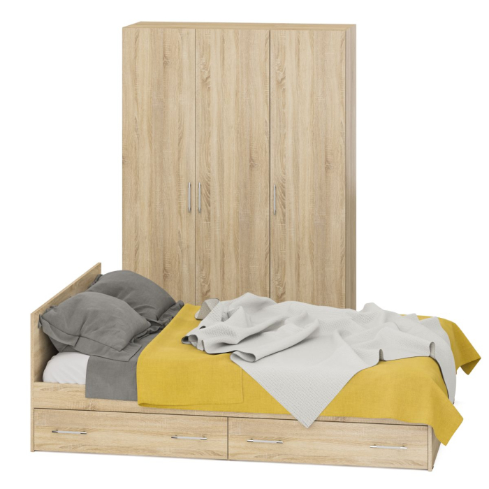 Спальный гарнитур № 1 состоит из двухспальной кровати с ящиками, 2-х створчатого шкафа для одежды и пенала, объединенных в единый блок. Функциональность, компактность и простота формы - три слагаемые дизайнерской идеи спален Стандарт. Классическая геометрия и спокойный природный тон мебели Стандарт поддержат базовый интерьер, легко сочетаясь с мебелью любого стиля. В комнату с такой нейтральной обстановкой легко добавить индивидуальности, расставив акценты с помощью креативных аксессуаров. Кровать Стандарт - надёжная, с устойчивым основанием и удобной спинкой, идеально подходит для детской комнаты. Сп.м. 1400х2000 мм, основание в комплекте (настил ДСП), матрас 1400х2000 мм. приобретается отдельно. В основании кровати расположены два вместительных ящика для хранения постельных принадлежностей и личных вещей. Определённый интерес мебель Стандарт представляет и для обустройства гостиничных номеров, пансионатов, детских лагерей. За распашными дверками шкафа для одежды расположены отделение со штангой для одежды на плечиках и антресольной полкой с одной стороны, и нишей с тремя полками с другой. Высокий пенал, за распашной дверкой которого расположены четыре съёмные полки. Универсальная дверь - сторону открывания двери Вы определятете при сборке. Спальный гарнитур № 1 имеет универсальный интерьер, который будет жить вне времени и моды, без необходимости обновления. Элегантная простота и эргономичность кровати, в сочетании с идеальным качеством исполнения, обещают удовольствие на долгие годы. Спальный гарнитур № 1 выполнен из экологически чистой ламинированной ДСП с классом эмиссии Е1, допустимым для детской мебели. В производстве мебели использована фурнитура высоких стандартов и обработка деталей противоударной кромкой ПХВ. Поставляется мебель в разобранном виде в надёжной упаковке, с комплектом фурнитуры и инструкцией по сборке.