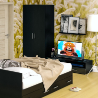 Спальня Стандарт № 3 состоит из двухспальной кровати, шкафа 2-х створчатого и тумбы под ТВ. Функциональность, компактность и простота формы - три слагаемые дизайнерской идеи спален Стандарт. Классическая геометрия и спокойный природный тон мебели Стандарт поддержат базовый интерьер, легко сочетаясь с мебелью любого стиля. В комнату с такой нейтральной обстановкой легко добавить индивидуальности, расставив акценты с помощью креативных аксессуаров. Кровать Стандарт - надёжная, с устойчивым основанием и удобной спинкой, идеально подходит для детской комнаты. Сп.м. 1600х2000 мм, основание в комплекте (настил ДСП), матрас 1600х2000 мм. приобретается отдельно. В основании кровати расположены два вместительных ящика для хранения постельных принадлежностей и личных вещей. Определённый интерес мебель Стандарт представляет и для обустройства гостиничных номеров, пансионатов, детских лагерей. За распашными дверками шкафа для одежды расположены отделение со штангой для одежды на плечиках и антресольной полкой с одной стороны, и нишей с тремя полками с другой. Тумба под ТВ придётся по вкусу любителям стильных элементов мебели в оформлении интерьера. Особый акцент данной модели - глянцевое покрытие фасадов, выполненных из МДФ 16 мм. с торцевой фрезеровкой в виде фацета и геометрической фрезеровкой откидной дверки. Линейный декор тумбы подчёркнут ручками-рейлингами, имеющих сочетанное хромированно-матовое покрытие. Конструктивно тумба разделена на два одинаковой ширины отделения. Слева расположена закрытая откидной дверкой ниша, справа - открытая ниша и выдвижной ящик. Установлена тумба на плоские, прочные и надёжные прямоугольные ножки. Пластиковые накладки на ножках защитят Ваше напольное покрытие от механических повреждений. Спальня Стандарт № 3 имеет универсальный интерьер, который будет жить вне времени и моды, без необходимости обновления. Элегантная простота и эргономичность кровати, в сочетании с идеальным качеством исполнения, обещают удовольствие на долгие годы. Спальня Стандарт № 3 выполнен из экологически чистой ламинированной ДСП с классом эмиссии Е1, допустимым для детской мебели. В производстве мебели использована фурнитура высоких стандартов и обработка деталей противоударной кромкой ПХВ. Поставляется мебель в разобранном виде в надёжной упаковке, с комплектом фурнитуры и инструкцией по сборке.