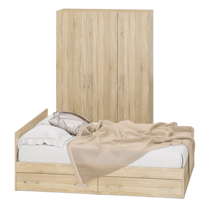 Спальный гарнитур № 1 состоит из двухспальной кровати с ящиками, 2-х створчатого шкафа для одежды и пенала, объединенных в единый блок. Функциональность, компактность и простота формы - три слагаемые дизайнерской идеи спален Стандарт. Классическая геометрия и спокойный природный тон мебели Стандарт поддержат базовый интерьер, легко сочетаясь с мебелью любого стиля. В комнату с такой нейтральной обстановкой легко добавить индивидуальности, расставив акценты с помощью креативных аксессуаров. Кровать Стандарт - надёжная, с устойчивым основанием и удобной спинкой, идеально подходит для детской комнаты. Сп.м. 1600х2000 мм, основание в комплекте (настил ДСП), матрас 1600х2000 мм. приобретается отдельно. В основании кровати расположены два вместительных ящика для хранения постельных принадлежностей и личных вещей. Определённый интерес мебель Стандарт представляет и для обустройства гостиничных номеров, пансионатов, детских лагерей. За распашными дверками шкафа для одежды расположены отделение со штангой для одежды на плечиках и антресольной полкой с одной стороны, и нишей с тремя полками с другой. Высокий пенал, за распашной дверкой которого расположены четыре съёмные полки. Универсальная дверь - сторону открывания двери Вы определятете при сборке. Спальный гарнитур № 1 имеет универсальный интерьер, который будет жить вне времени и моды, без необходимости обновления. Элегантная простота и эргономичность кровати, в сочетании с идеальным качеством исполнения, обещают удовольствие на долгие годы. Спальный гарнитур № 1 выполнен из экологически чистой ламинированной ДСП с классом эмиссии Е1, допустимым для детской мебели. В производстве мебели использована фурнитура высоких стандартов и обработка деталей противоударной кромкой ПХВ. Поставляется мебель в разобранном виде в надёжной упаковке, с комплектом фурнитуры и инструкцией по сборке.