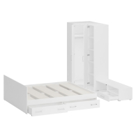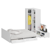 Мебель для спальни Стандарт № 4 состоит из двухспальной кровати с ящиками, объединенных в единый блок углового шкафа и пенала, и тумбы под ТВ. Функциональность, компактность и простота формы - три слагаемые дизайнерской идеи спален Стандарт. Классическая геометрия и спокойный природный тон мебели Стандарт поддержат базовый интерьер, легко сочетаясь с мебелью любого стиля. В комнату с такой нейтральной обстановкой легко добавить индивидуальности, расставив акценты с помощью креативных аксессуаров. Кровать Стандарт - надёжная, с устойчивым основанием и удобной спинкой, идеально подходит для детской комнаты. Сп.м. 1800х2000 мм, основание в комплекте (настил ДСП), матрас 18900х2000 мм. приобретается отдельно. В основании кровати расположены два вместительных ящика для хранения постельных принадлежностей и личных вещей. Определённый интерес мебель Стандарт представляет и для обустройства гостиничных номеров, пансионатов, детских лагерей. Гардеробный блок представлен угловым шкафом и пеналом. За распашной дверкой шкафа углового расположены два отделения - со штангой для одежды на плечиках и антресольной полкой с одной стороны, и нишей с тремя полками с другой. Универсальная сборка - сторону открывания двери и располажение отделений внутри шкафа - Вы определятете при сборке. Боковина шкафа углового для соединения с другой мебелью имеет глубину 52 см. Высокий пенал, за распашной дверкой которого расположены четыре съёмные полки. Универсальная дверь - сторону открывания двери Вы определятете при сборке. Тумба под ТВ придётся по вкусу любителям стильных элементов мебели в оформлении интерьера. Особый акцент данной модели - глянцевое покрытие фасадов, выполненных из МДФ 16 мм. с торцевой фрезеровкой в виде фацета и геометрической фрезеровкой откидной дверки. Линейный декор тумбы подчёркнут ручками-рейлингами, имеющих сочетанное хромированно-матовое покрытие. Конструктивно тумба разделена на два одинаковой ширины отделения. Слева расположена закрытая откидной дверкой ниша, справа - открытая ниша и выдвижной ящик. Установлена тумба на плоские, прочные и надёжные прямоугольные ножки. Пластиковые накладки на ножках защитят Ваше напольное покрытие от механических повреждений. Мебель для спальни Стандарт № 4 имеет универсальный интерьер, который будет жить вне времени и моды, без необходимости обновления. Элегантная простота и эргономичность кровати, в сочетании с идеальным качеством исполнения, обещают удовольствие на долгие годы. Мебель для спальни Стандарт № 4 выполнена из экологически чистой ламинированной ДСП с классом эмиссии Е1, допустимым для детской мебели. В производстве мебели использована фурнитура высоких стандартов и обработка деталей противоударной кромкой ПХВ. Поставляется мебель в разобранном виде в надёжной упаковке, с комплектом фурнитуры и инструкцией по сборке.