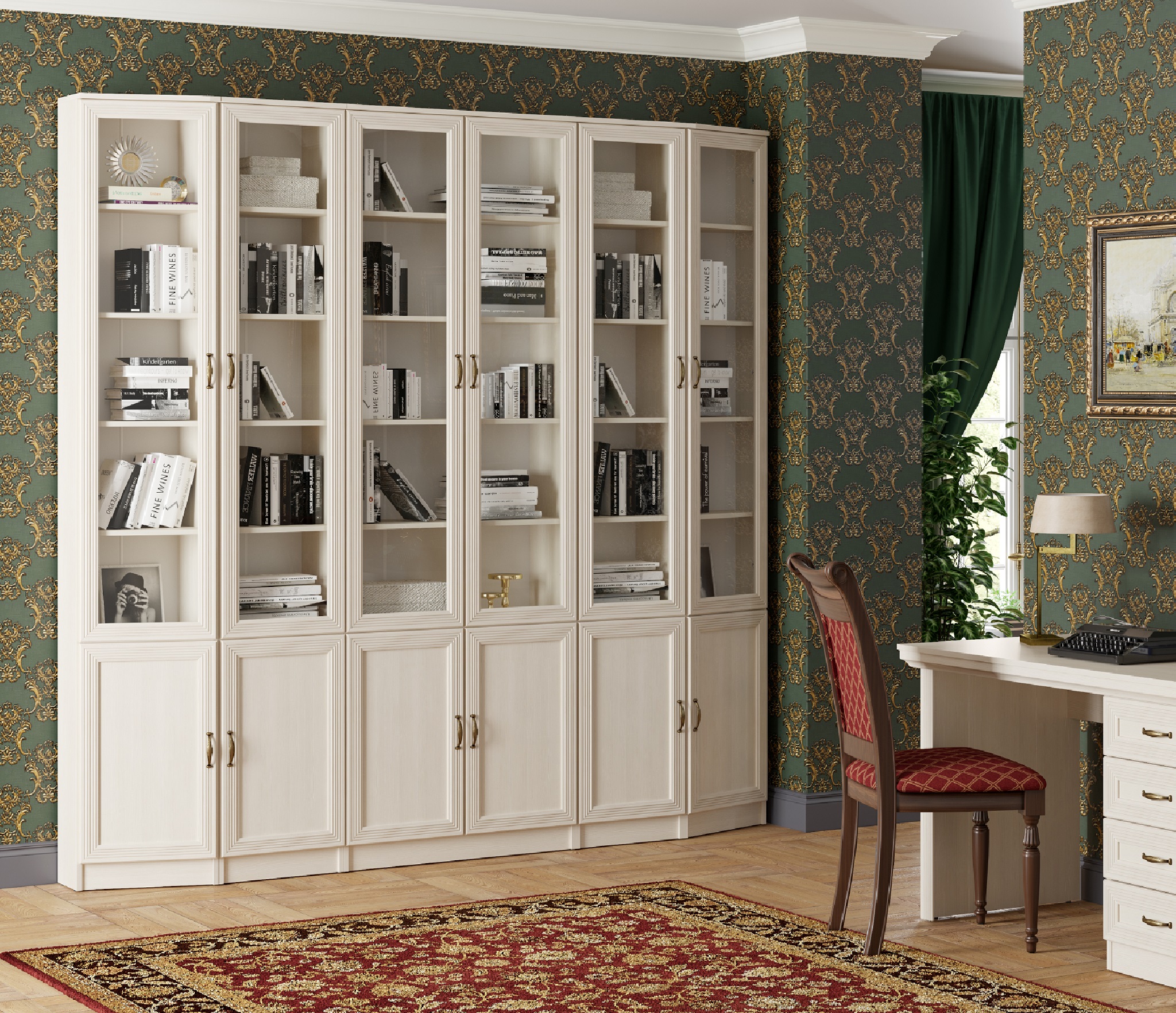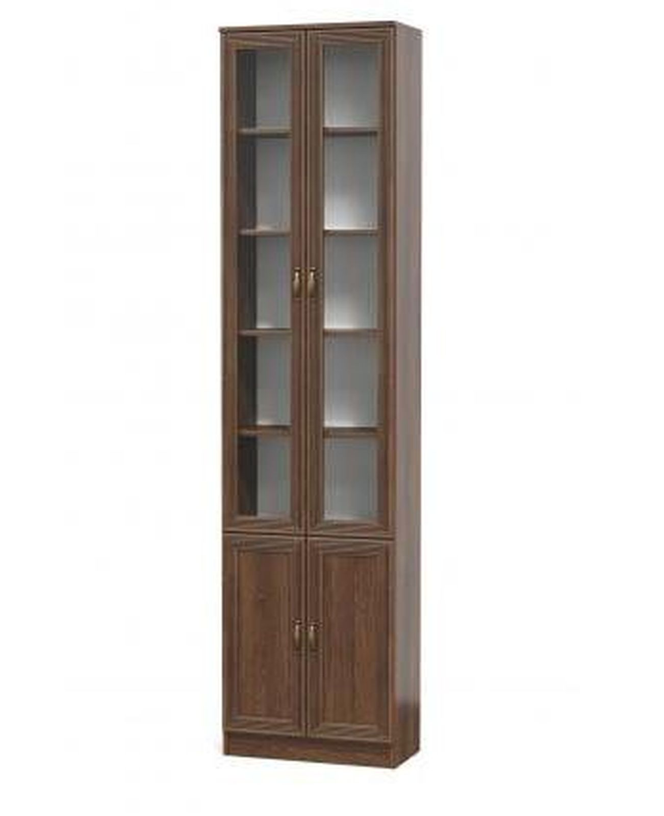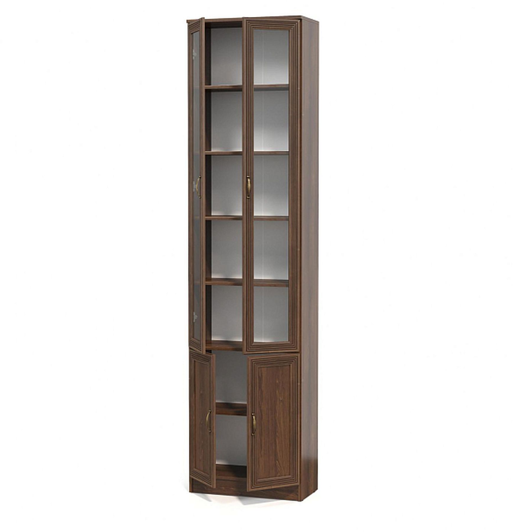 Шкаф имеет 4 распашные двери, две из которых стеклянные.