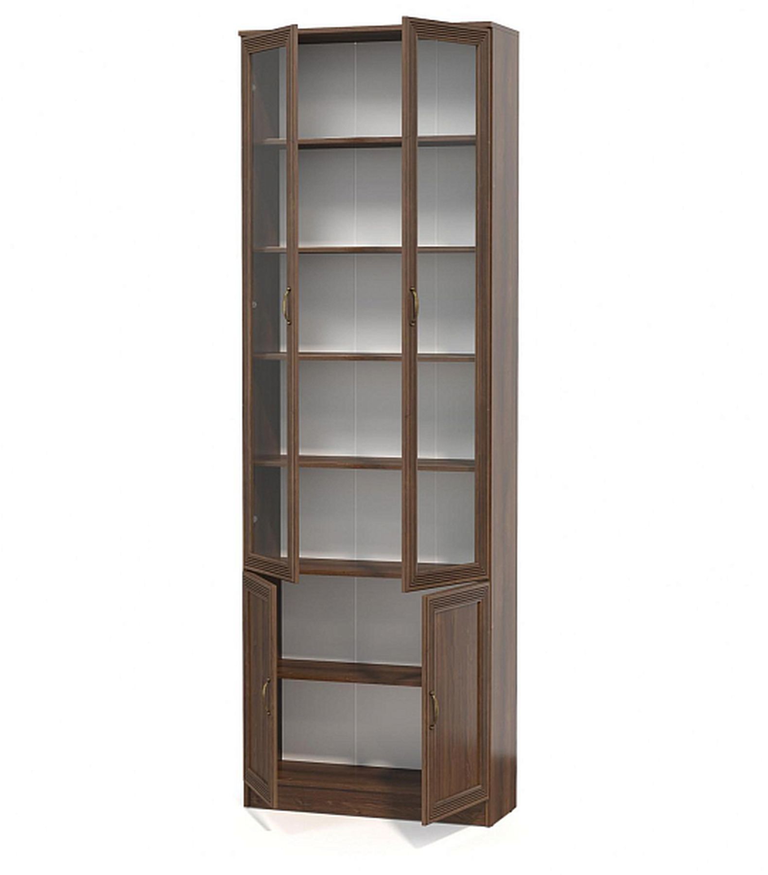 Шкаф имеет 4 распашные двери, две из которых стеклянные.