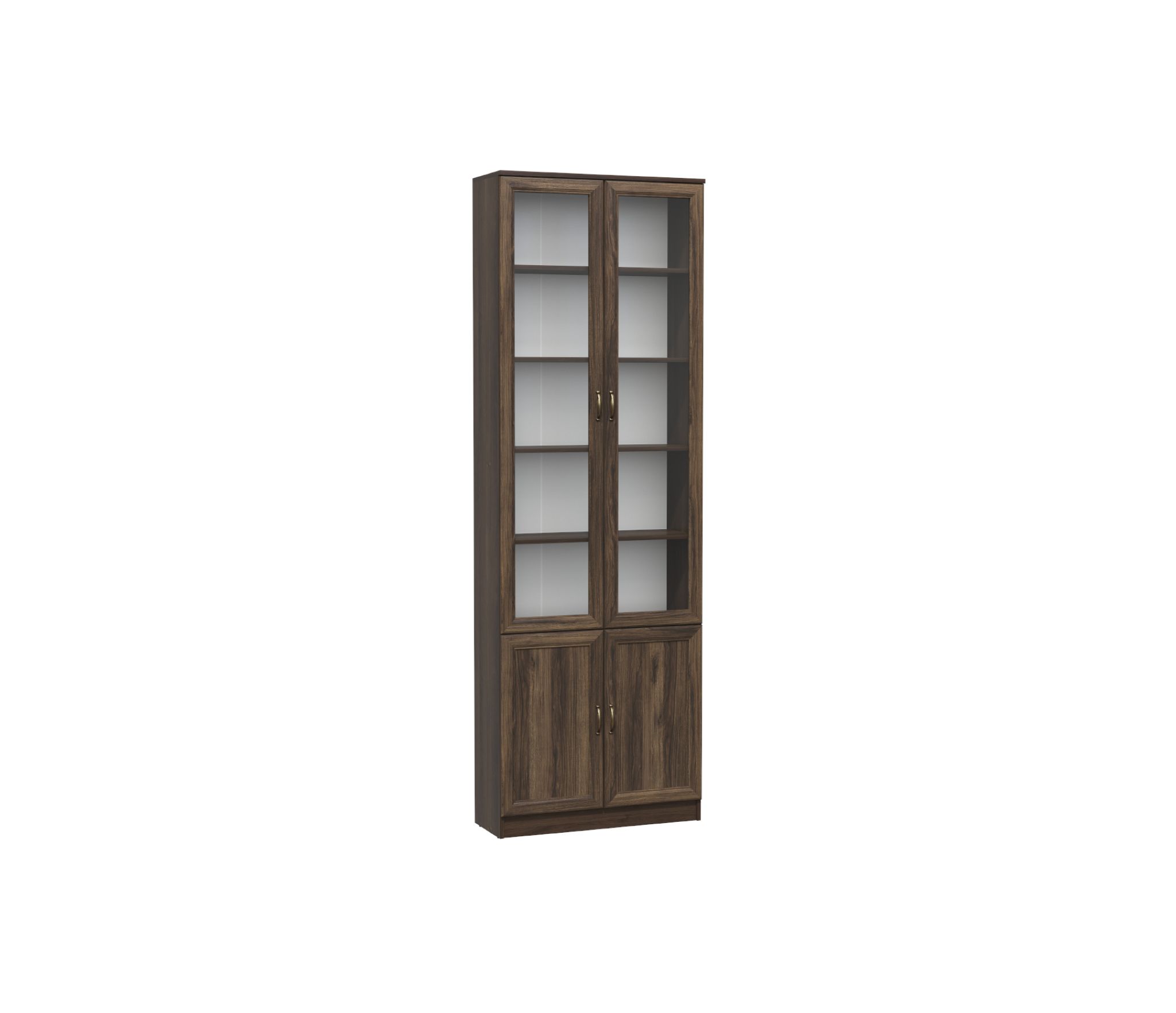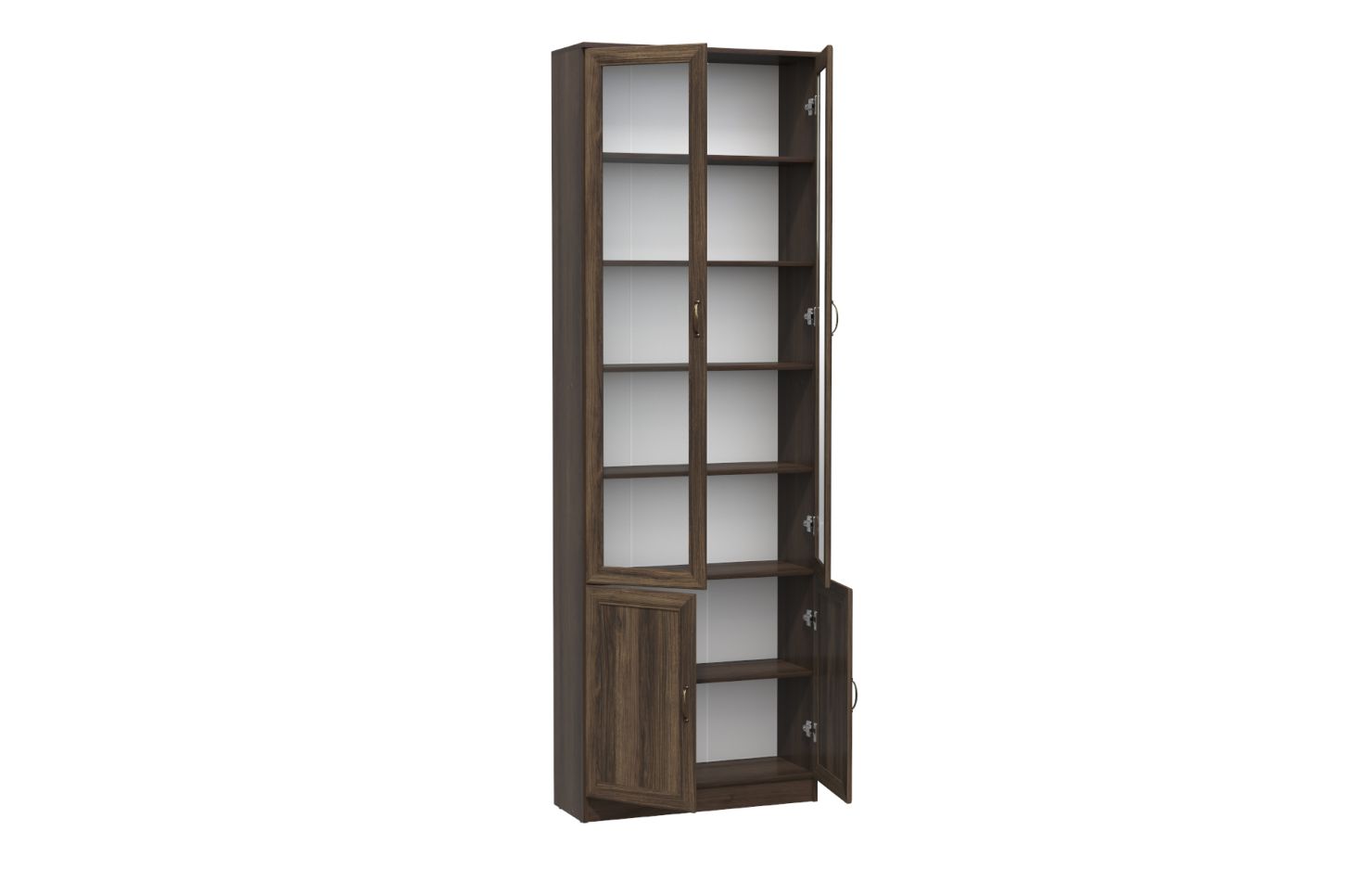 Шкаф имеет 4 распашные двери, две из которых стеклянные.