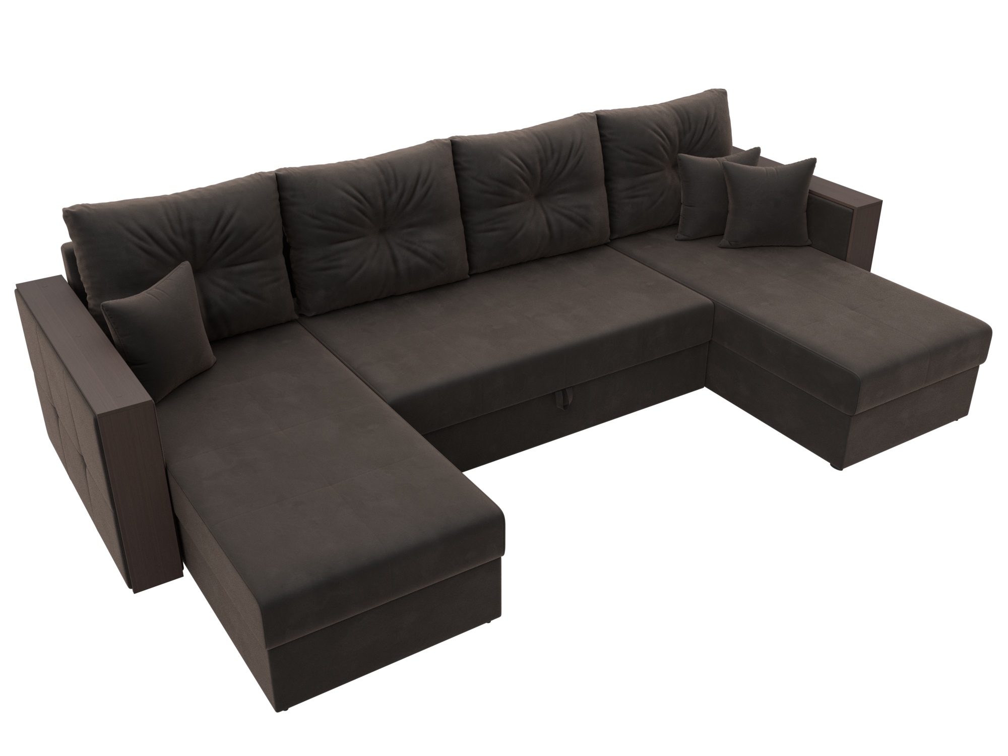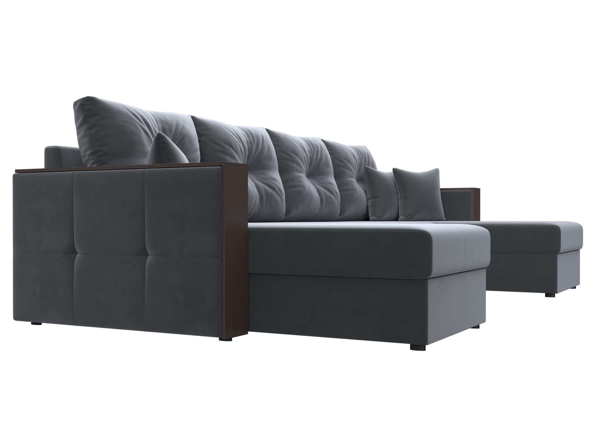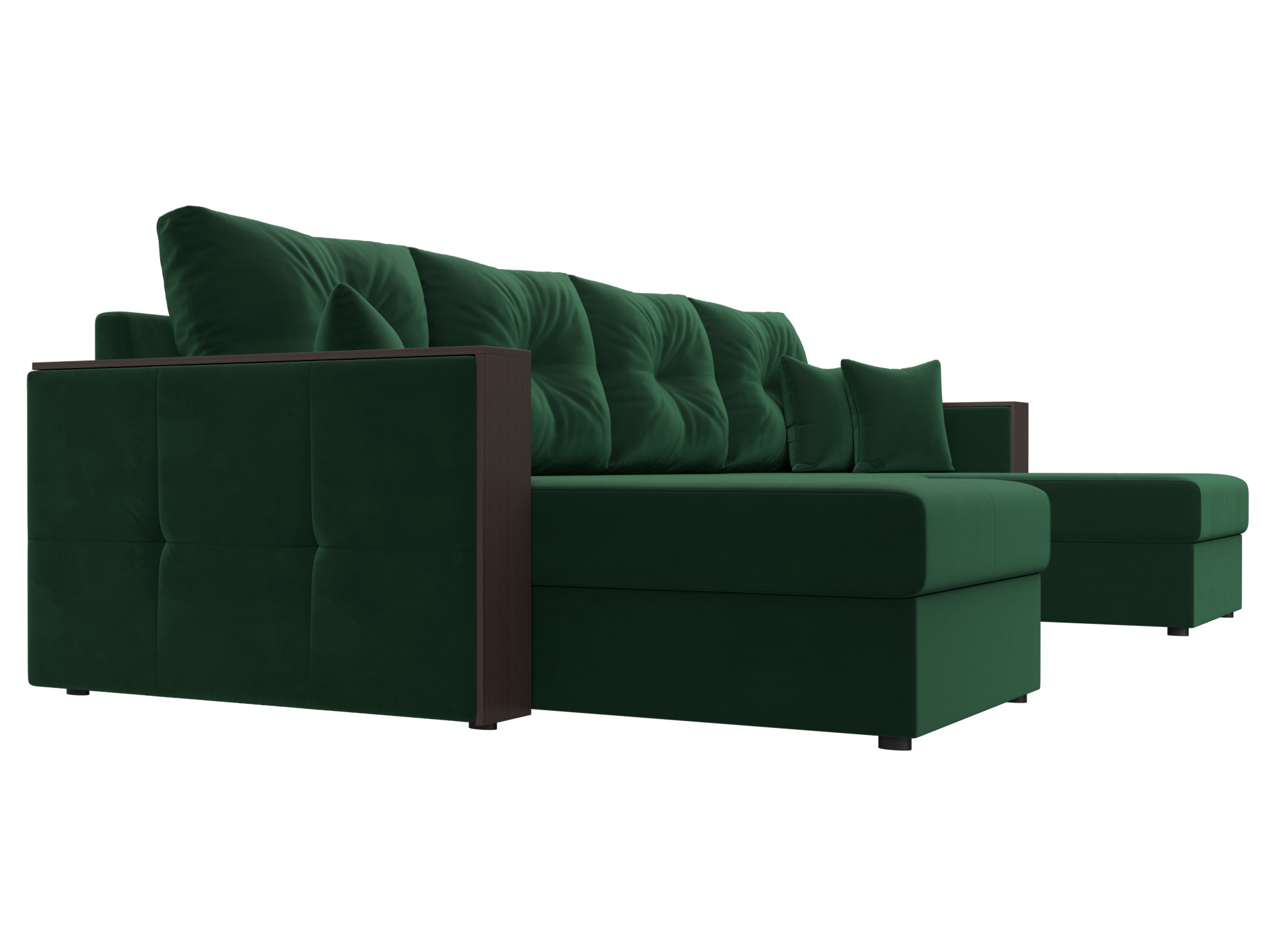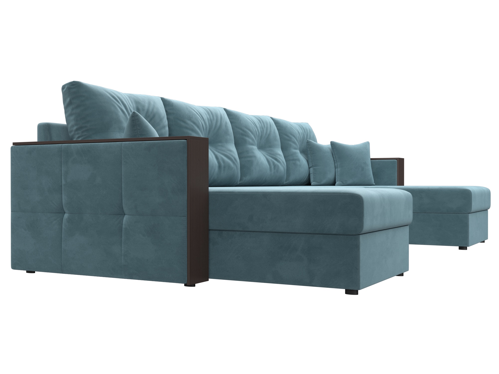 Спальный П-образный диван Валенсия – отражение изысканной испанской классики. В нем оригинально сочетаются натуральные ткани и дерево. Спинка образуется за счет объемных подушек. Подлокотники – это удобные столики с идеально ровной поверхностью. Диван дополнен вместительными ящиками для белья.