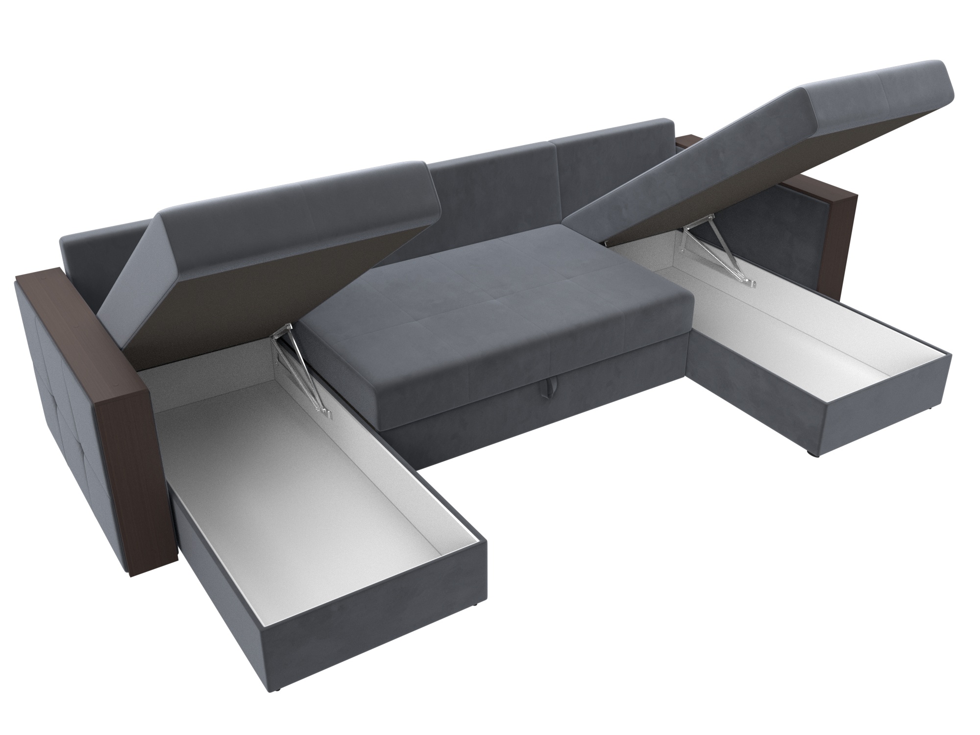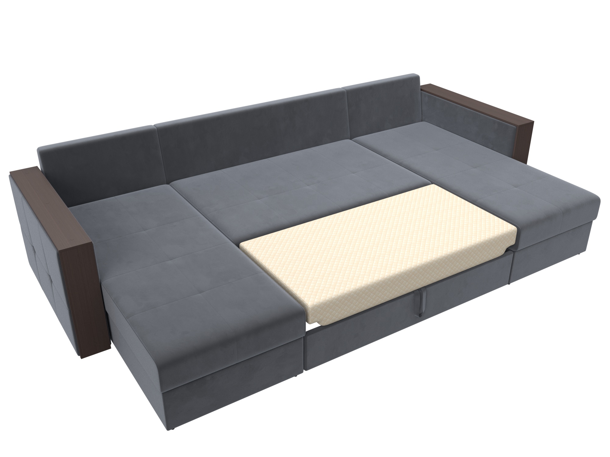 Спальный П-образный диван Валенсия – отражение изысканной испанской классики. В нем оригинально сочетаются натуральные ткани и дерево. Спинка образуется за счет объемных подушек. Подлокотники – это удобные столики с идеально ровной поверхностью. Диван дополнен вместительными ящиками для белья.