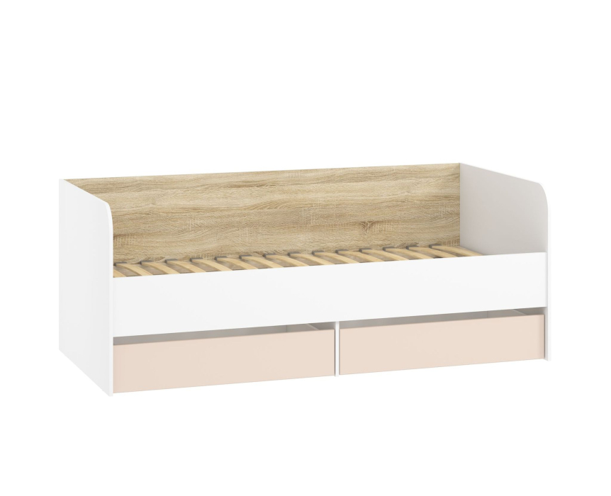 Конструкция с задней спинкой и двумя боковыми бортиками. Кровать оснащена ящиками для хранения белья. Исполнение в модной комбинированной расцветке.