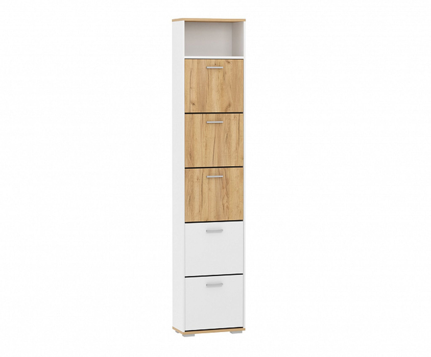 Модель оборудована 5-ю откидными секциями для обуви и открытой полкой для мелочей. Глубина 280 мм обеспечит размещение в любом месте помещения.