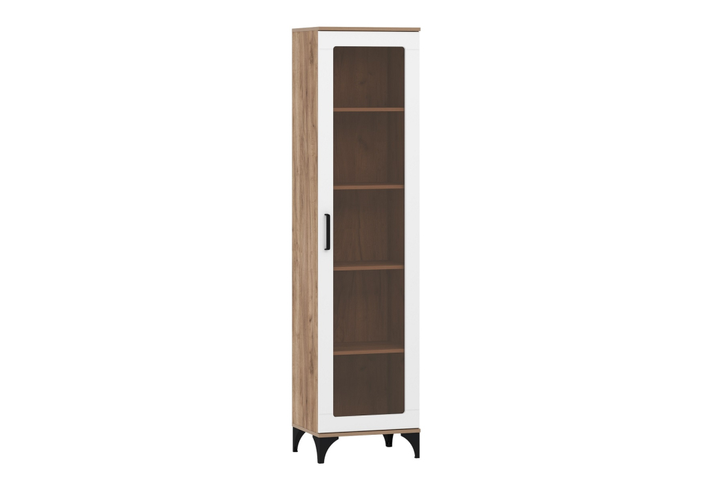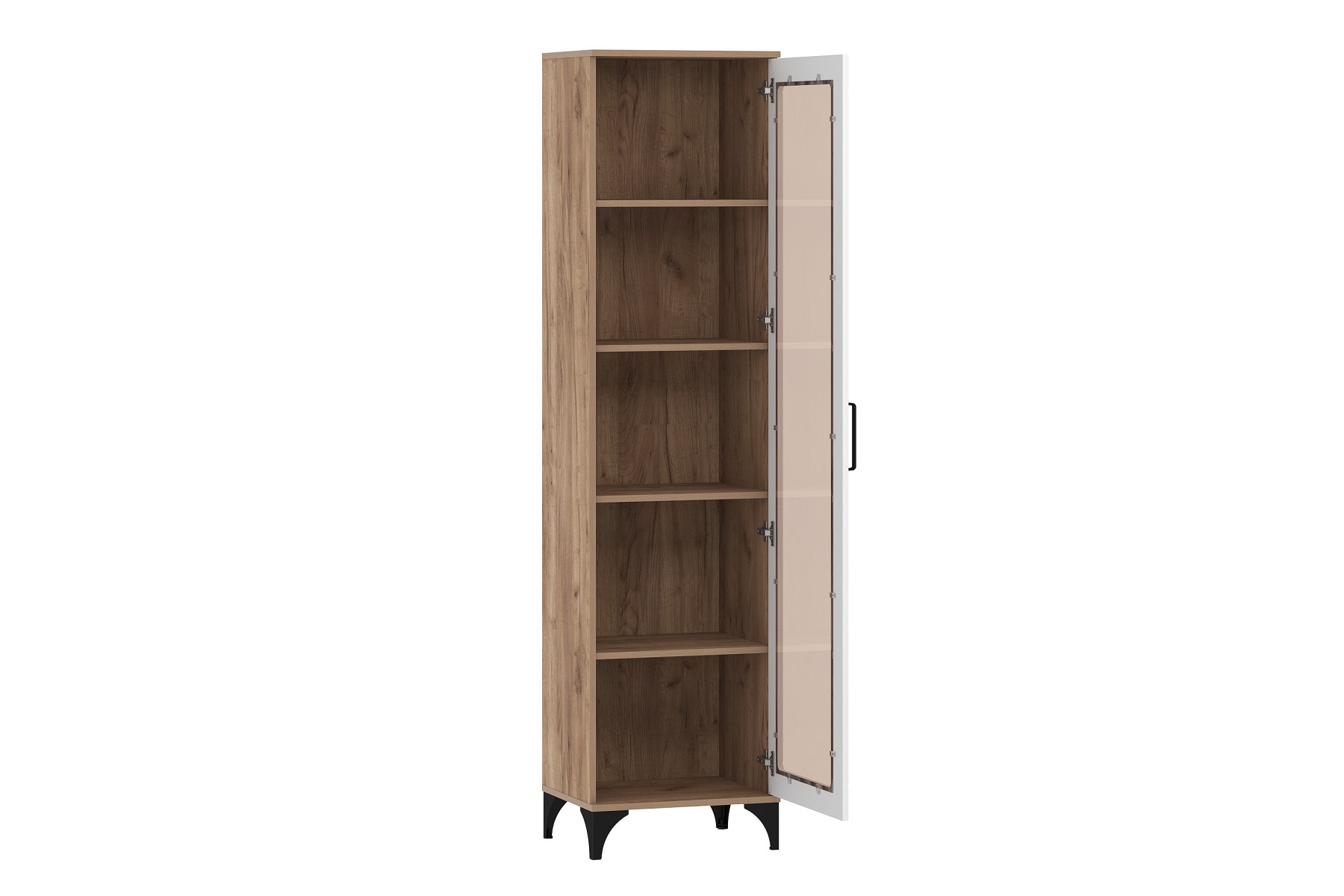 Шкаф-пенал из серии "Марсель" со стеклом в распашной двери . Шкаф установлен на высокие ножки и оборудован 4-мя полками.Сборка универсальная на правую и левую стороны.