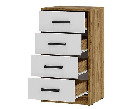 Высокий комод Мия отлично справится с вопросом хранения одежды в сложенном виде, вещей, постельного белья, игрушек, сезонных аксессуаров и всего того, что должно храниться в порядке. 4 выдвижных ящика оснащены роликовыми направляющими и удобными ручками. Регулируемые опоры позволяют установить комод даже на неровном полу.