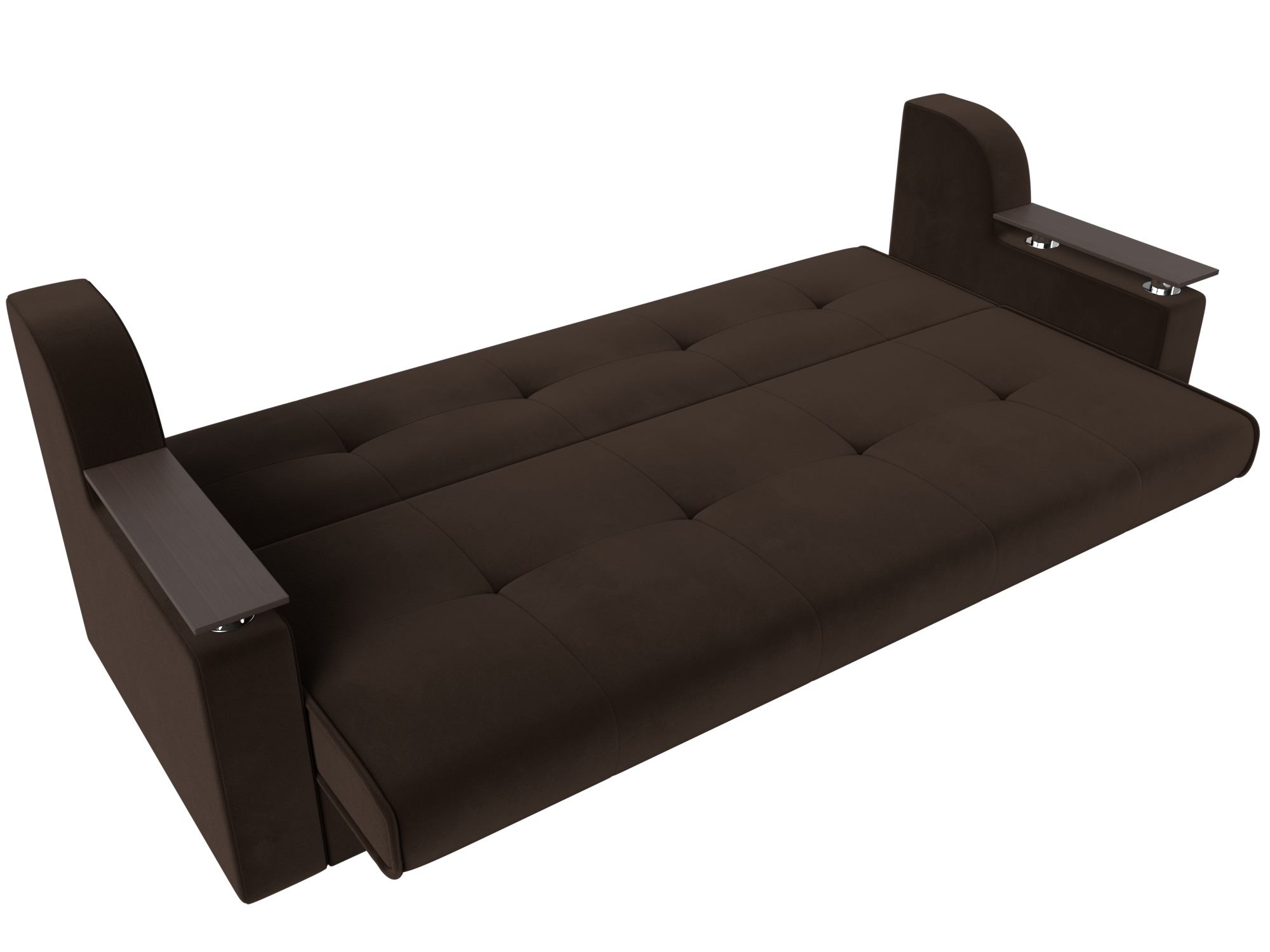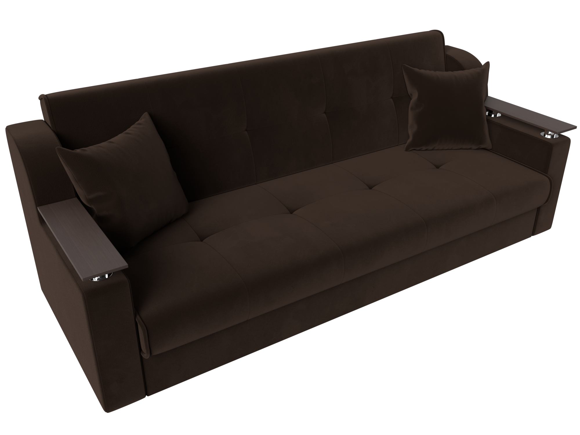 Сенатор – мягкий прямой диван с эргономичной спинкой и мини-столиками по бокам. Он устойчиво стоит на 4 пластиковых ножках, идеально гармонирующих с общим дизайном. Спинка прямая, без съемных подушек, подлокотники деревянные, выполняют роль столиков. Классический механизм «книжка» позволяет быстро трансформировать его в удобную двуспальную кровать.