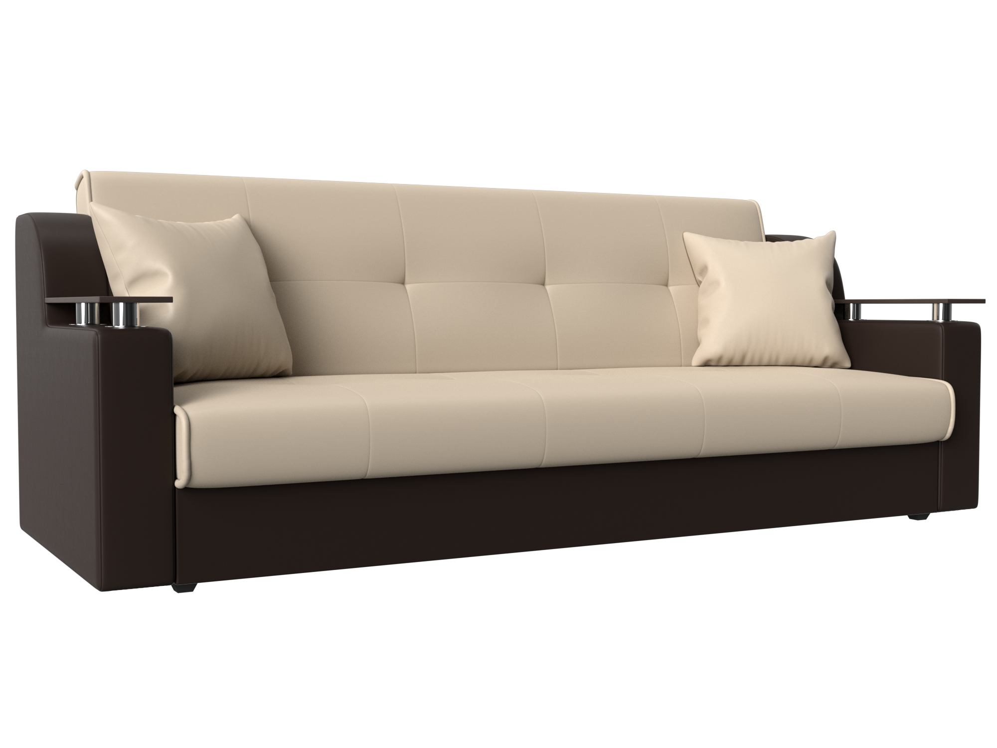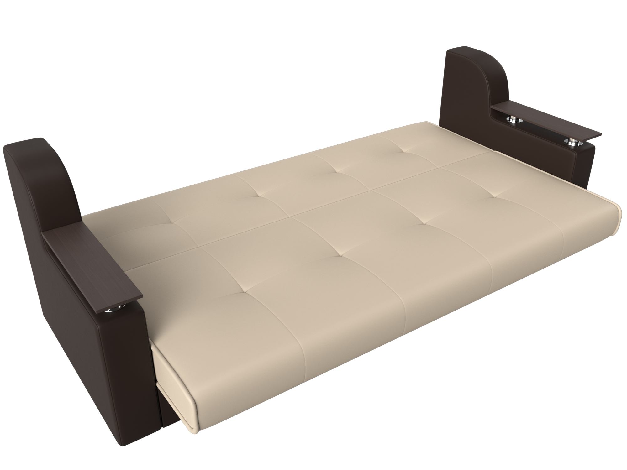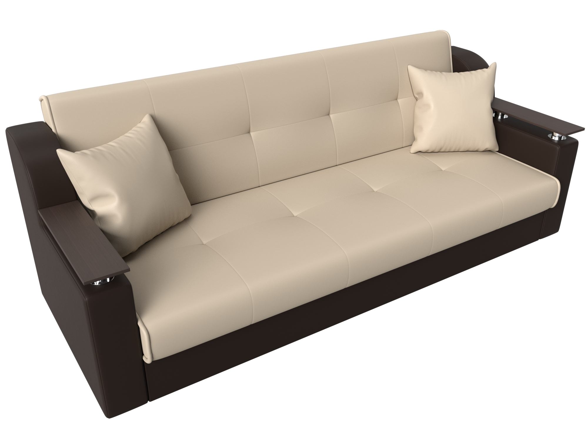 Сенатор – мягкий прямой диван с эргономичной спинкой и мини-столиками по бокам. Он устойчиво стоит на 4 пластиковых ножках, идеально гармонирующих с общим дизайном. Спинка прямая, без съемных подушек, подлокотники деревянные, выполняют роль столиков. Классический механизм «книжка» позволяет быстро трансформировать его в удобную двуспальную кровать.