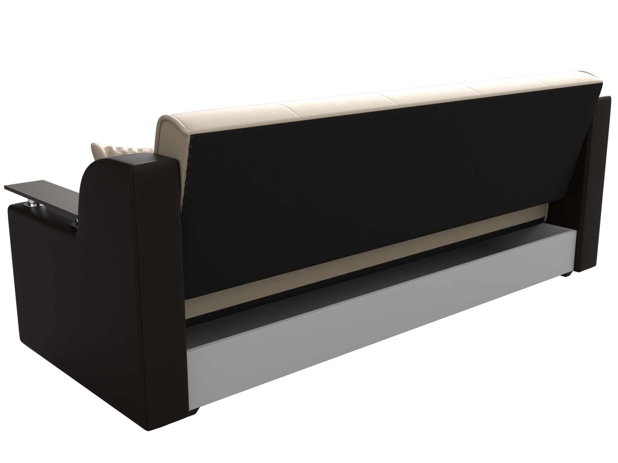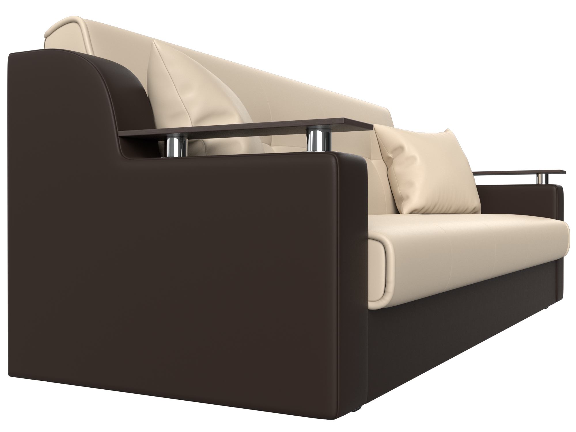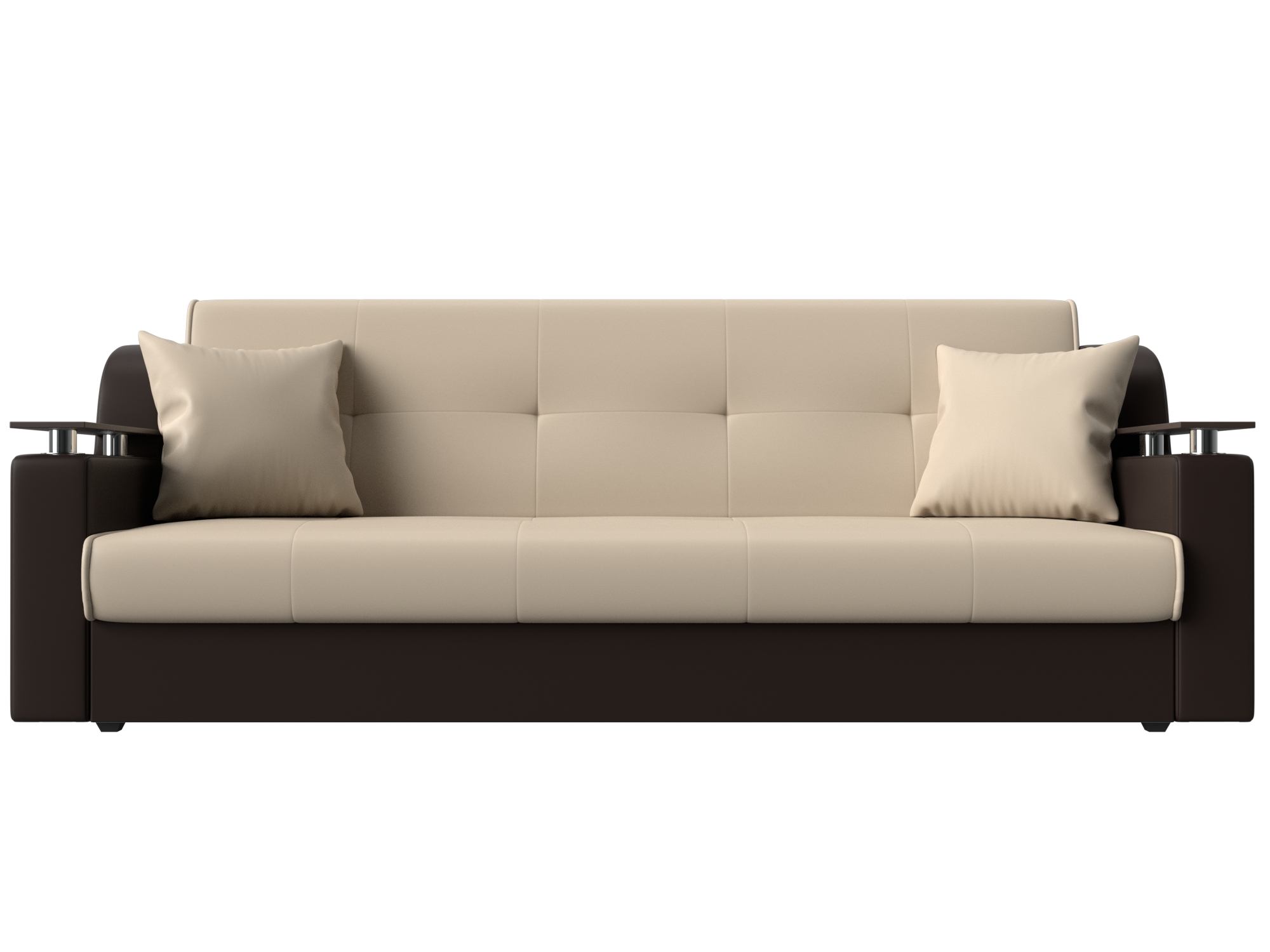 Сенатор – мягкий прямой диван с эргономичной спинкой и мини-столиками по бокам. Он устойчиво стоит на 4 пластиковых ножках, идеально гармонирующих с общим дизайном. Спинка прямая, без съемных подушек, подлокотники деревянные, выполняют роль столиков. Классический механизм «книжка» позволяет быстро трансформировать его в удобную двуспальную кровать.