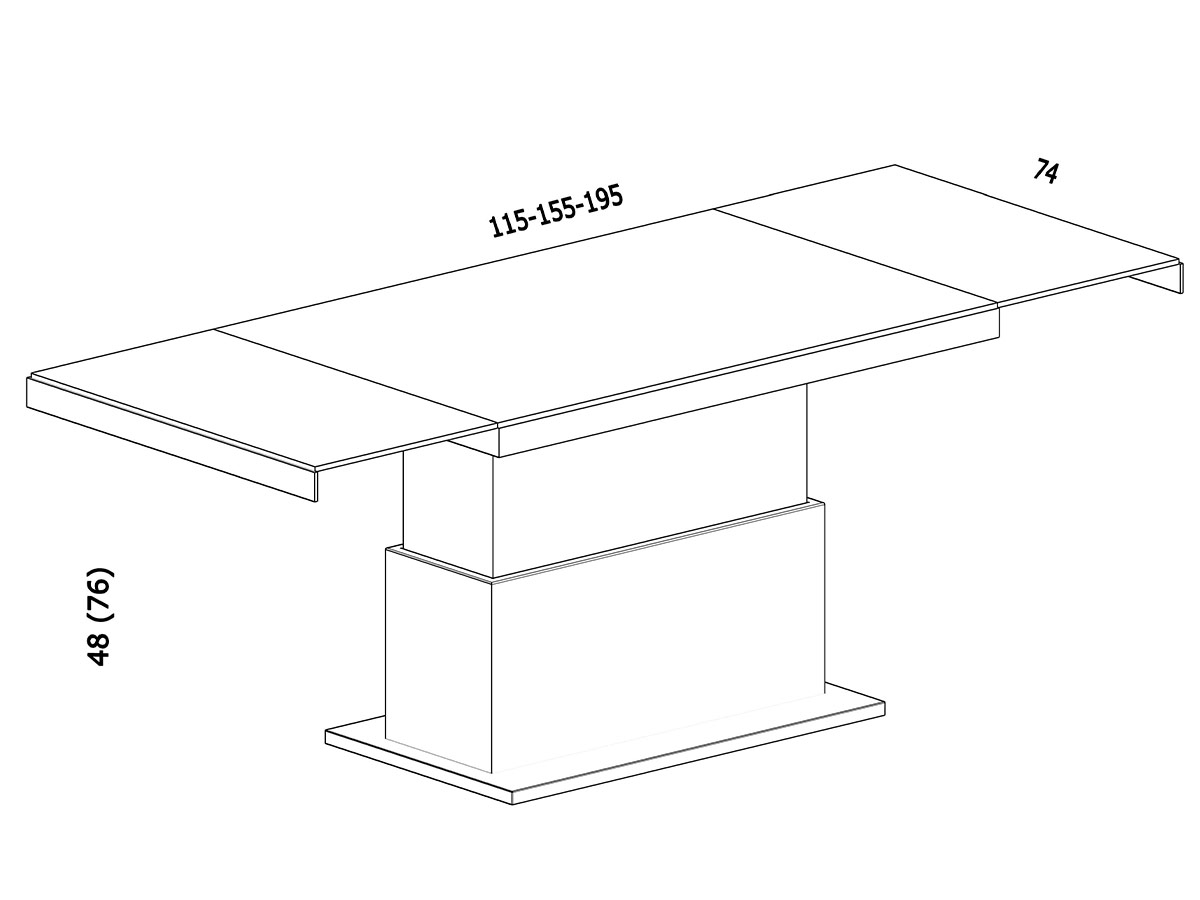 - Размеры в верхнем положении: Д: 115-155-195см x Ш: 74см x В: 48-76см