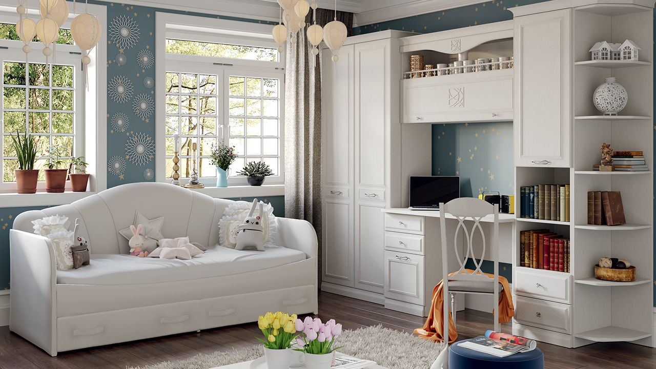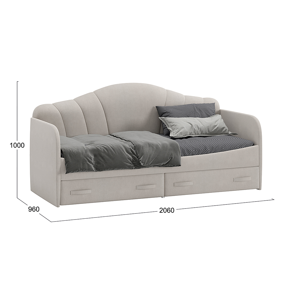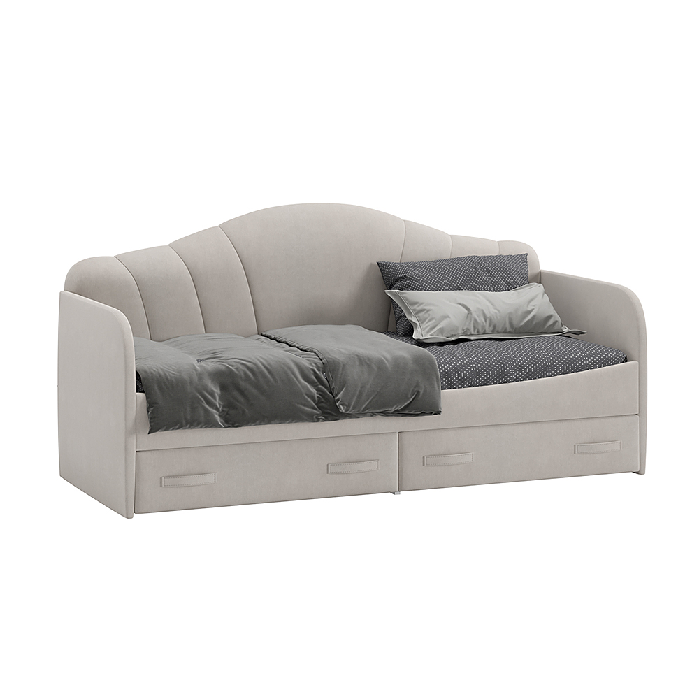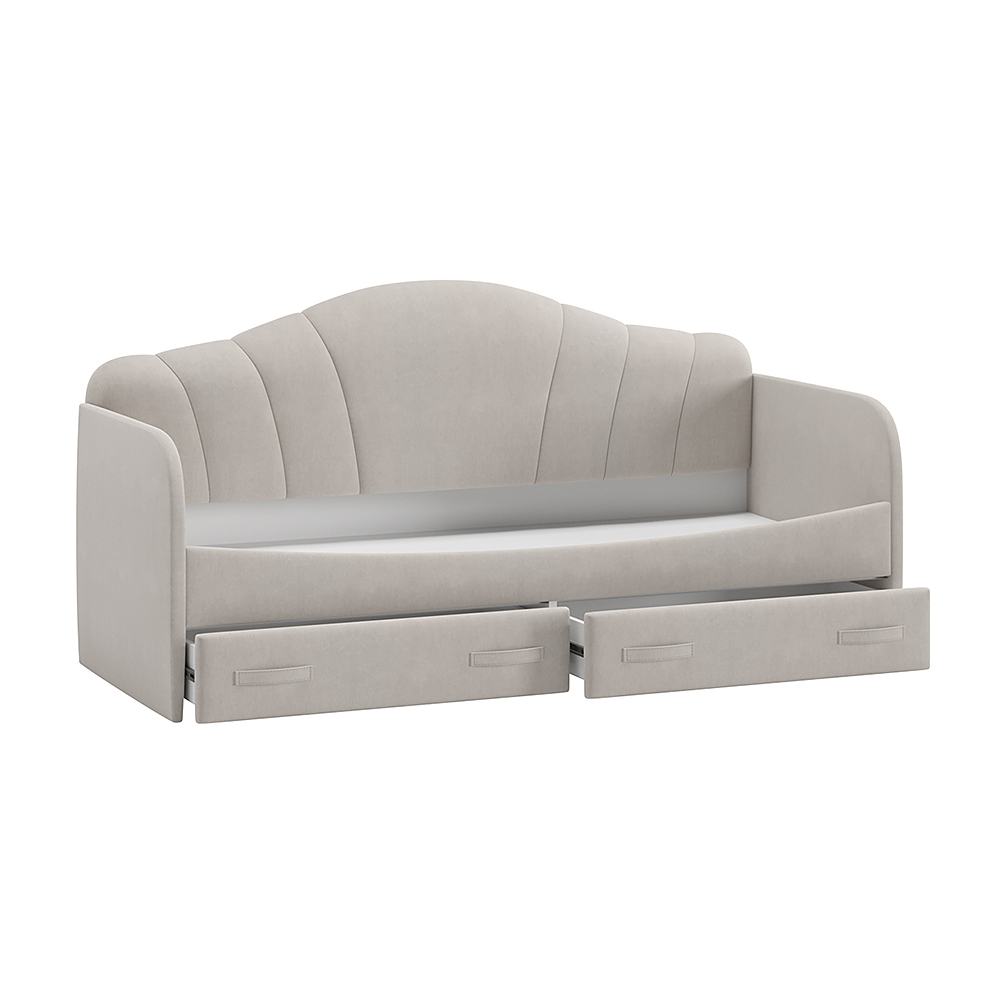 Благодаря своей конструкции кровать отлично разместится вдоль стены и сохранит полезное пространство комнаты. Днем это замечательный диванчик, а ночью – спальное место. Важной деталью комнаты является возможность рационального хранения, поэтому кровать оборудована двумя выдвижными ящиками, которые пригодятся для хранения игрушек и постельного белья.