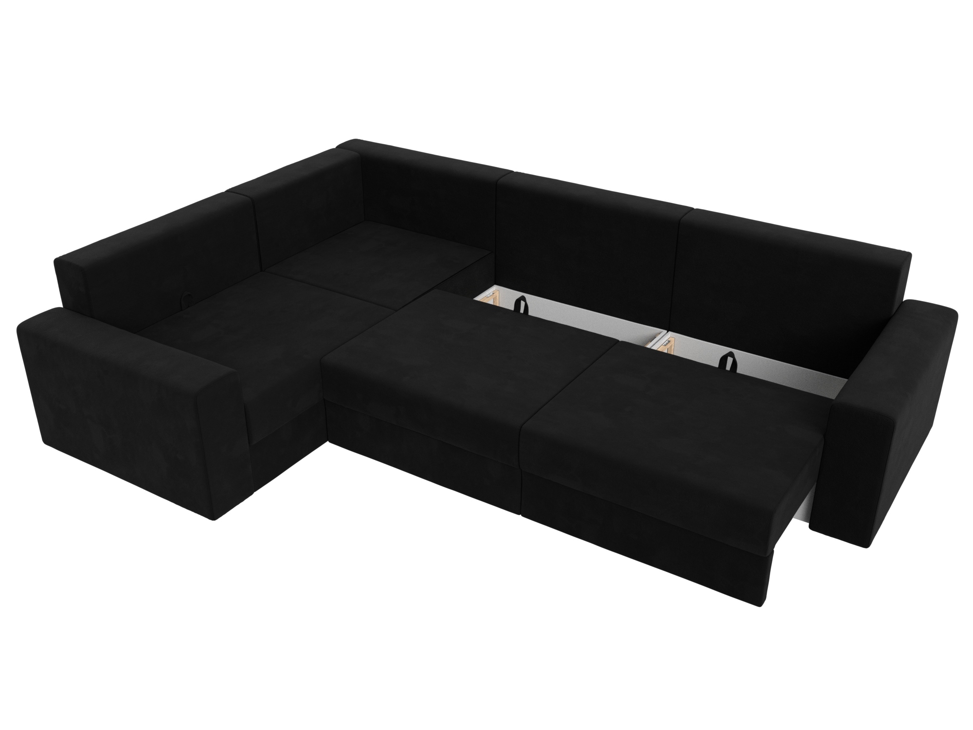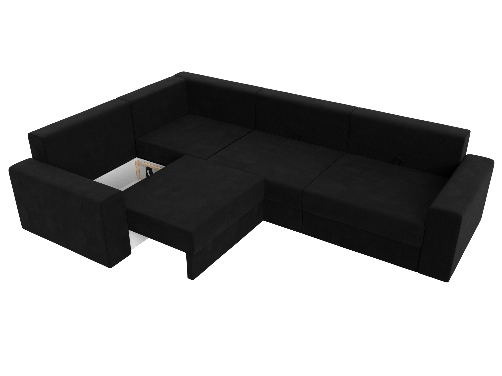 Механизм: еврокнижка. Нижняя часть углового дивана легко выдвигается на ножках-роликах, образуя нишу. В нее опускается установленная на кронштейны спинка.