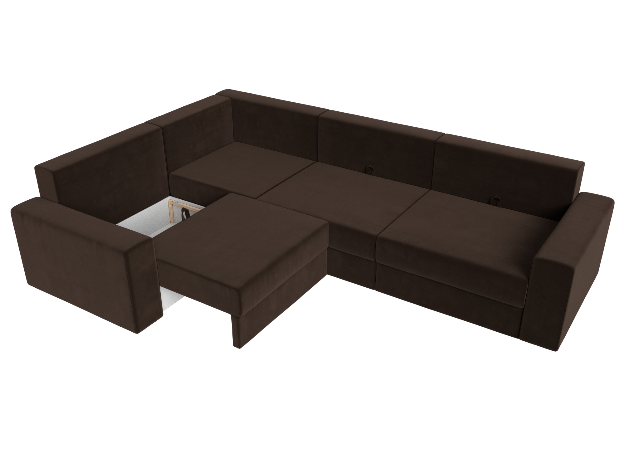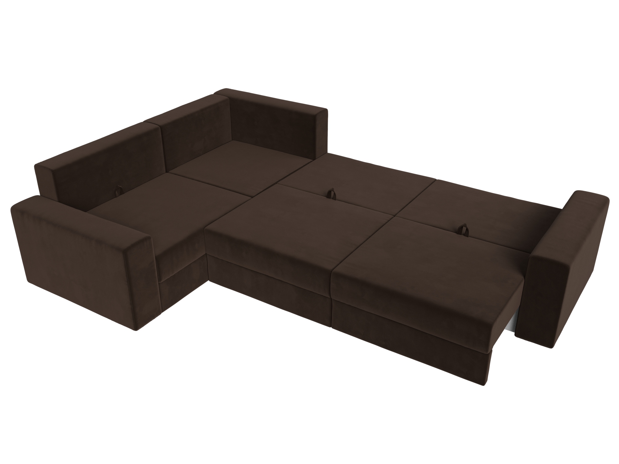 Механизм: еврокнижка. Нижняя часть углового дивана легко выдвигается на ножках-роликах, образуя нишу. В нее опускается установленная на кронштейны спинка.