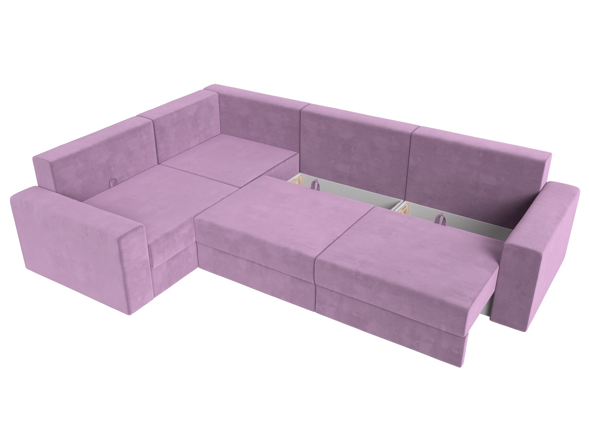 Механизм: еврокнижка. Нижняя часть углового дивана легко выдвигается на ножках-роликах, образуя нишу. В нее опускается установленная на кронштейны спинка.