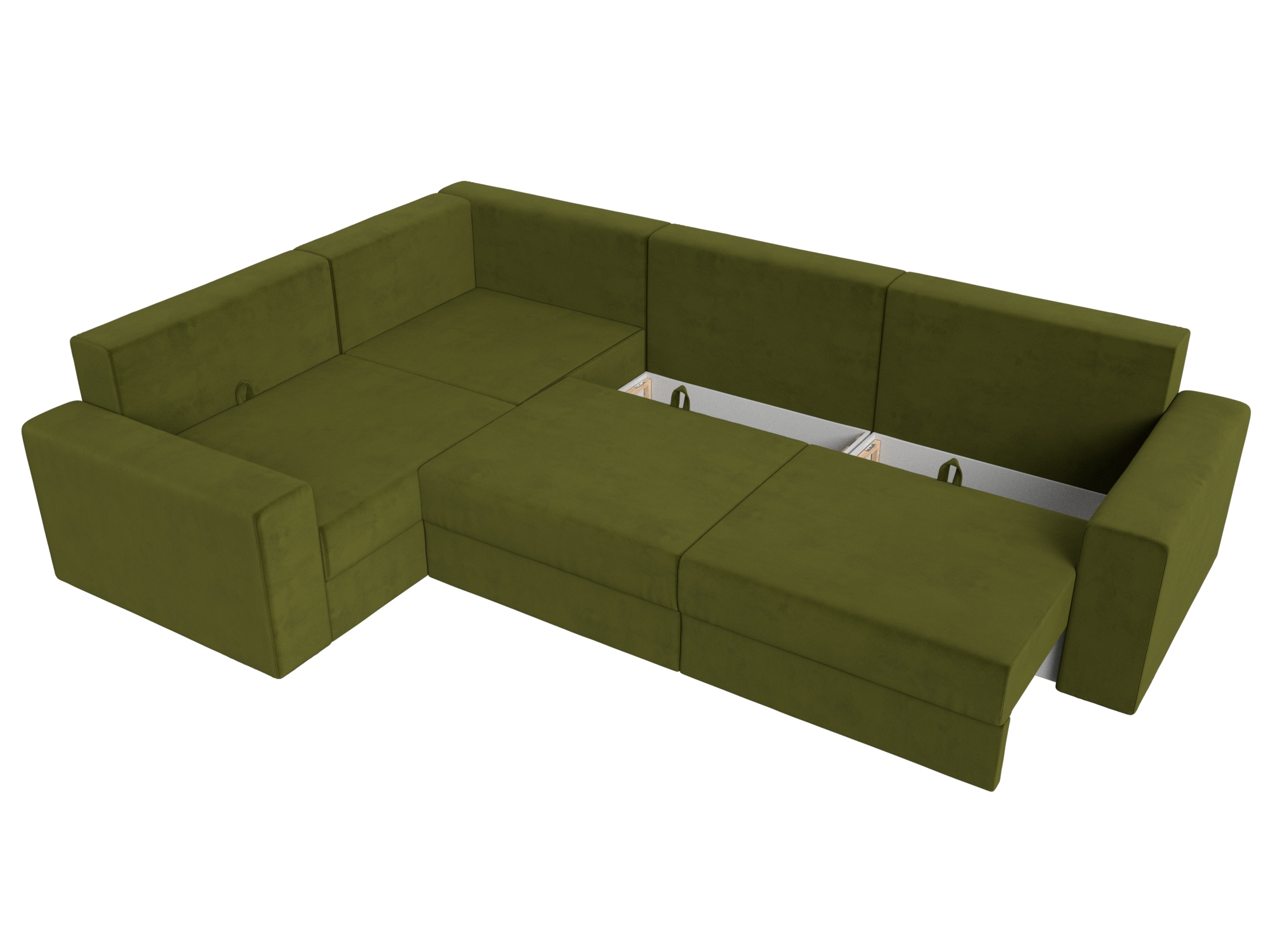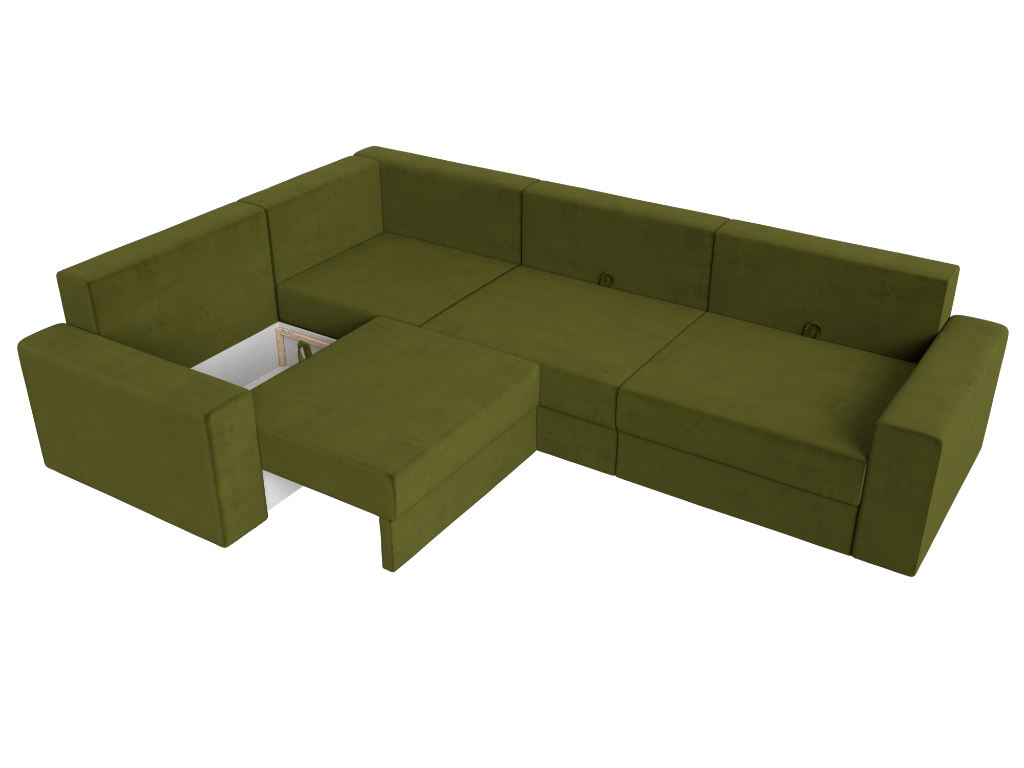 Механизм: еврокнижка. Нижняя часть углового дивана легко выдвигается на ножках-роликах, образуя нишу. В нее опускается установленная на кронштейны спинка.