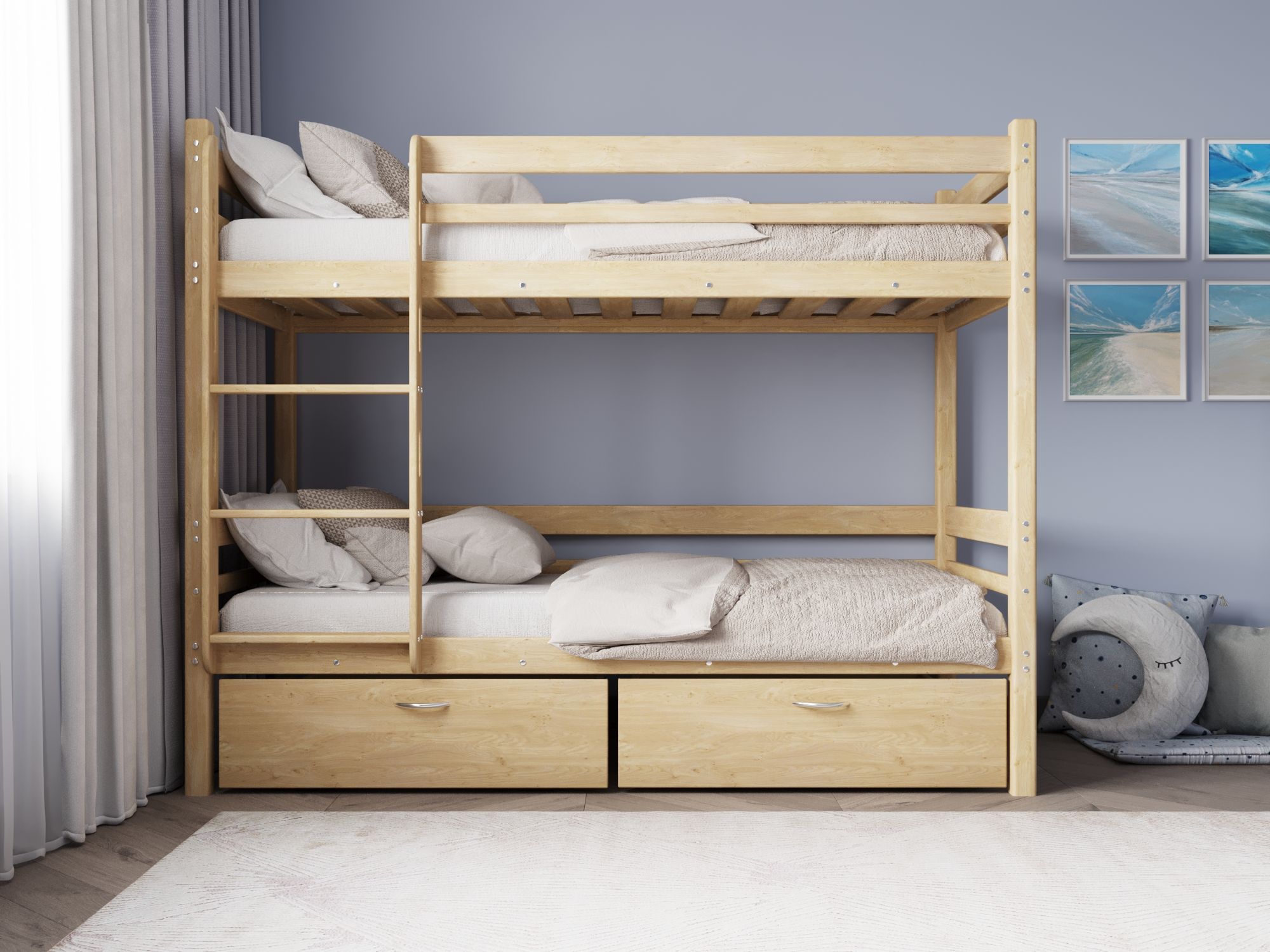 устанавливаемым на втором ярусе, фурнитурой и шестигранным ключом, необходимым для проведения сборки/разборки кровати. В дополнение можно приобрести эргономичные выкатные ящики для хранения игрушек, белья и других вещей.
