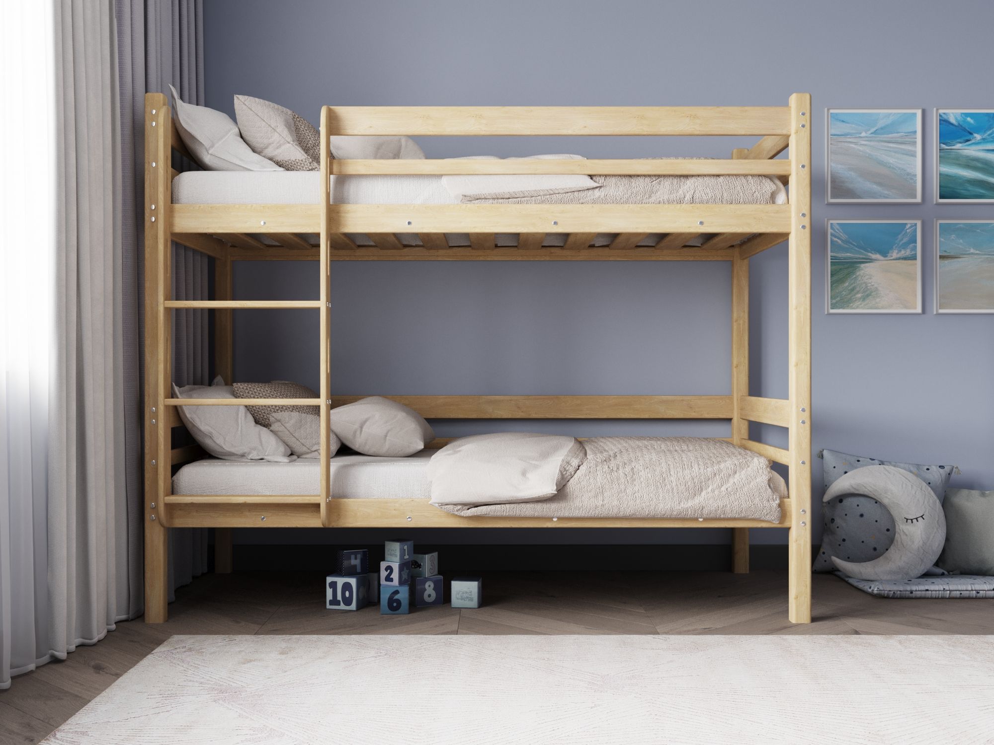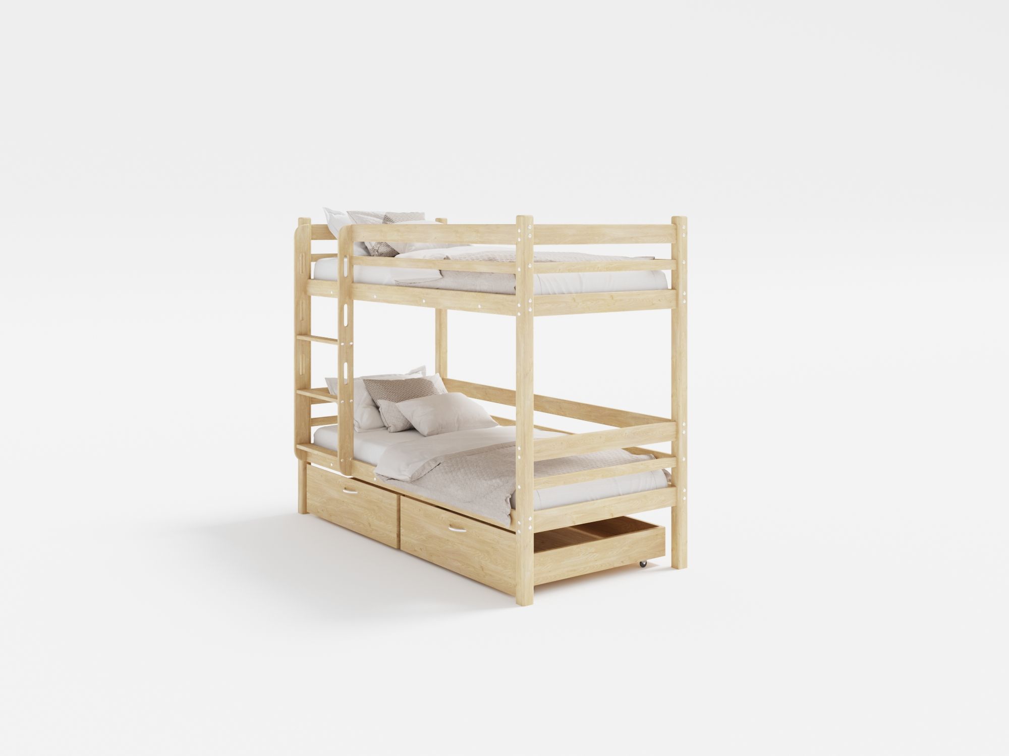 устанавливаемым на втором ярусе, фурнитурой и шестигранным ключом, необходимым для проведения сборки/разборки кровати. В дополнение можно приобрести эргономичные выкатные ящики для хранения игрушек, белья и других вещей.