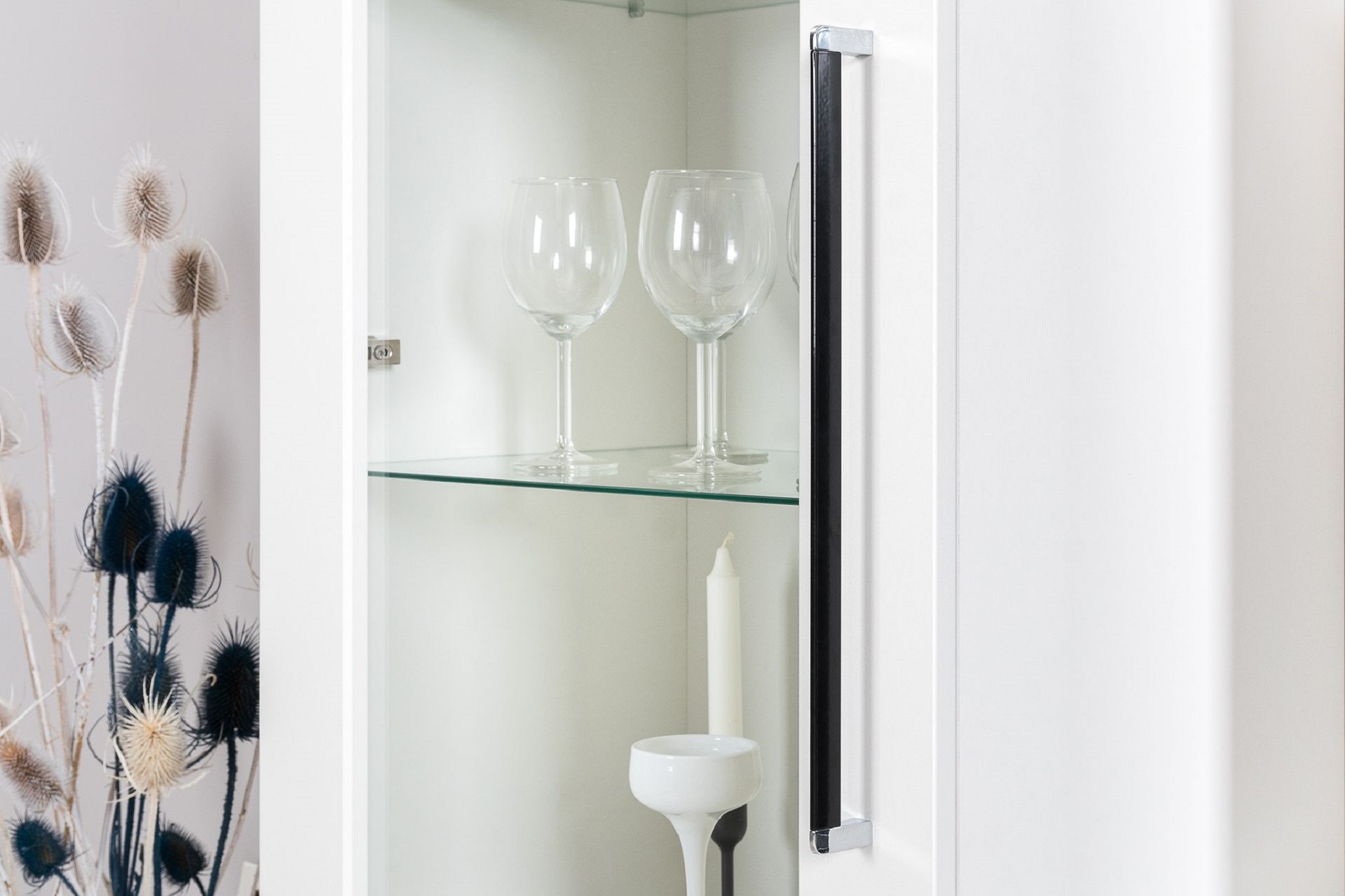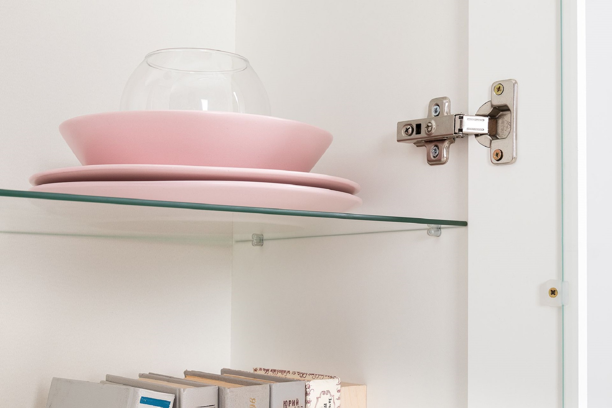 Модель оборудована распашной дверцей со стеклянной вставкой. Внутри шкафа расположены полки.