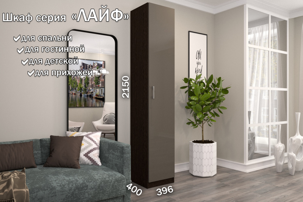 Стильные и удобные корпусные шкафы и наборные корпусные элементы «Лайф» – одно из самых выгодных предложений серийной мебели. Уникальностью данных шкафов, является возможность вносить изменения при сборке. Внутренние детали крепятся на эксцентриках, что позволяет в момент сборки изделия менять секций местами, это дает возможность выбрать максимально удобное расположение. Отличительные особенности шкафов «Лайф» – качественные материалы, удобная комплектация внутреннего наполнения и отличная фурнитура, которая обеспечивает долговечность использования и дает простоту и надежность сборки. Данная серия может комбинироваться в любых четырех цветах на корпус изделия и в любых четырех цветах на фасады изделия на усмотрение и вкус покупателя. Используемые цвета корпуса: Венге, Дуб Сонома, Дуб Экспрессив бронзовый, Северное дерево. Используемые цвета на фасады изделия из материала МДФ Высокий глянец: Белый Бриллиант, Латте, Макиато, Антрацит