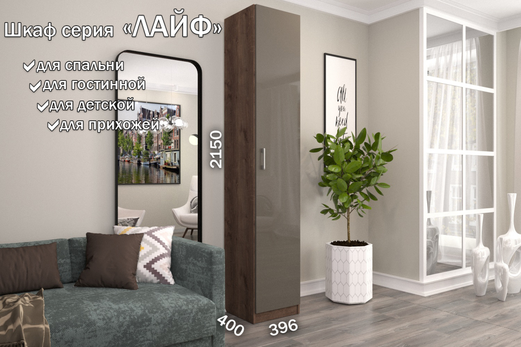Стильные и удобные корпусные шкафы и наборные корпусные элементы «Лайф» – одно из самых выгодных предложений серийной мебели. Уникальностью данных шкафов, является возможность вносить изменения при сборке. Внутренние детали крепятся на эксцентриках, что позволяет в момент сборки изделия менять секций местами, это дает возможность выбрать максимально удобное расположение. Отличительные особенности шкафов «Лайф» – качественные материалы, удобная комплектация внутреннего наполнения и отличная фурнитура, которая обеспечивает долговечность использования и дает простоту и надежность сборки. Данная серия может комбинироваться в любых четырех цветах на корпус изделия и в любых четырех цветах на фасады изделия на усмотрение и вкус покупателя. Используемые цвета корпуса: Венге, Дуб Сонома, Дуб Экспрессив бронзовый, Северное дерево. Используемые цвета на фасады изделия из материала МДФ Высокий глянец: Белый Бриллиант, Латте, Макиато, Антрацит