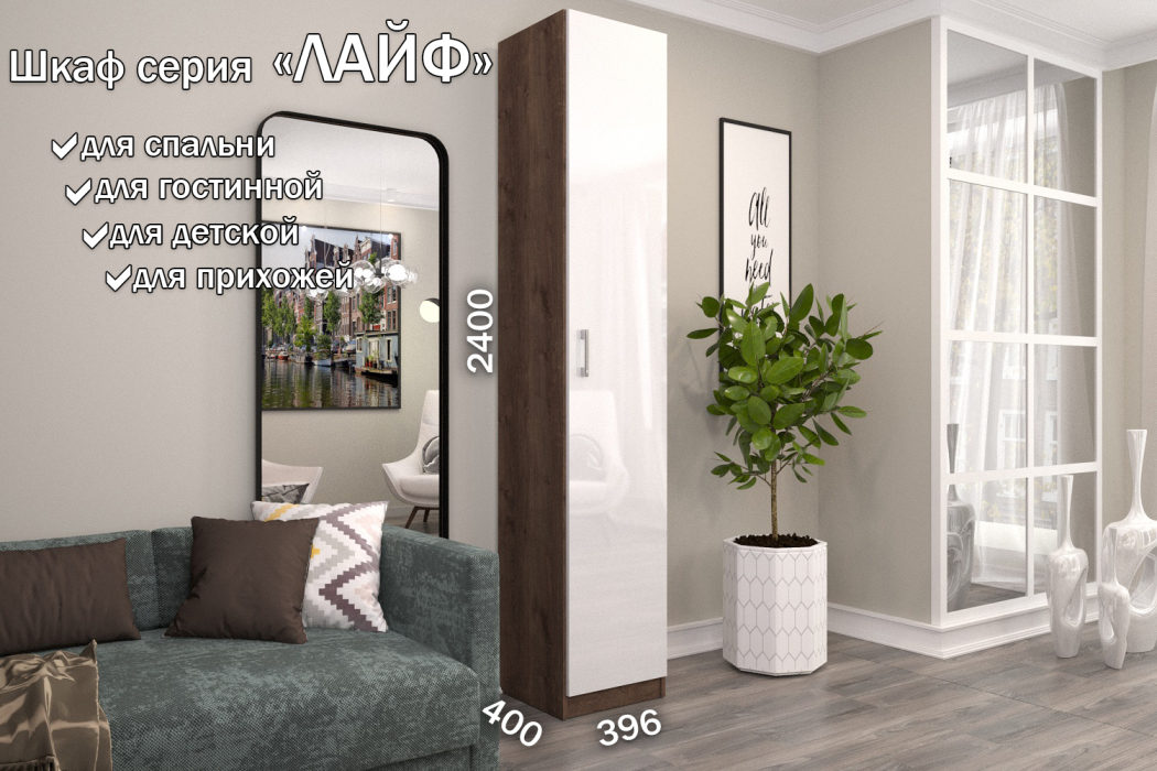 Стильные и удобные корпусные шкафы и наборные корпусные элементы «Лайф» – одно из самых выгодных предложений серийной мебели. Уникальностью данных шкафов, является возможность вносить изменения при сборке. Внутренние детали крепятся на эксцентриках, что позволяет в момент сборки изделия менять секций местами, это дает возможность выбрать максимально удобное расположение. Отличительные особенности шкафов «Лайф» – качественные материалы, удобная комплектация внутреннего наполнения и отличная фурнитура, которая обеспечивает долговечность использования и дает простоту и надежность сборки. Данная серия может комбинироваться в любых четырех цветах на корпус изделия и в любых четырех цветах на фасады изделия на усмотрение и вкус покупателя. Используемые цвета корпуса: Венге, Дуб Сонома, Дуб Экспрессив бронзовый, Северное дерево. Используемые цвета на фасады изделия из материала МДФ Высокий глянец: Белый Бриллиант, Латте, Макиато, Антрацит