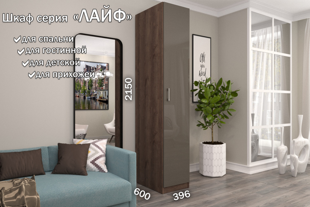 Стильные и удобные корпусные шкафы и наборные корпусные элементы «Лайф» – одно из самых выгодных предложений серийной мебели. Уникальностью данных шкафов, является возможность вносить изменения при сборке. Внутренние детали крепятся на эксцентриках, что позволяет в момент сборки изделия менять секций местами, это дает возможность выбрать максимально удобное расположение. Отличительные особенности шкафов «Лайф» – качественные материалы, удобная комплектация внутреннего наполнения и отличная фурнитура, которая обеспечивает долговечность использования и дает простоту и надежность сборки. Данная серия может комбинироваться в любых четырех цветах на корпус изделия и в любых четырех цветах на фасады изделия на усмотрение и вкус покупателя. Используемые цвета корпуса: Венге, Дуб Сонома, Дуб Экспрессив бронзовый, Северное дерево. Используемые цвета на фасады изделия из материала МДФ Высокий глянец: Белый Бриллиант, Латте, Макиато, Антрацит