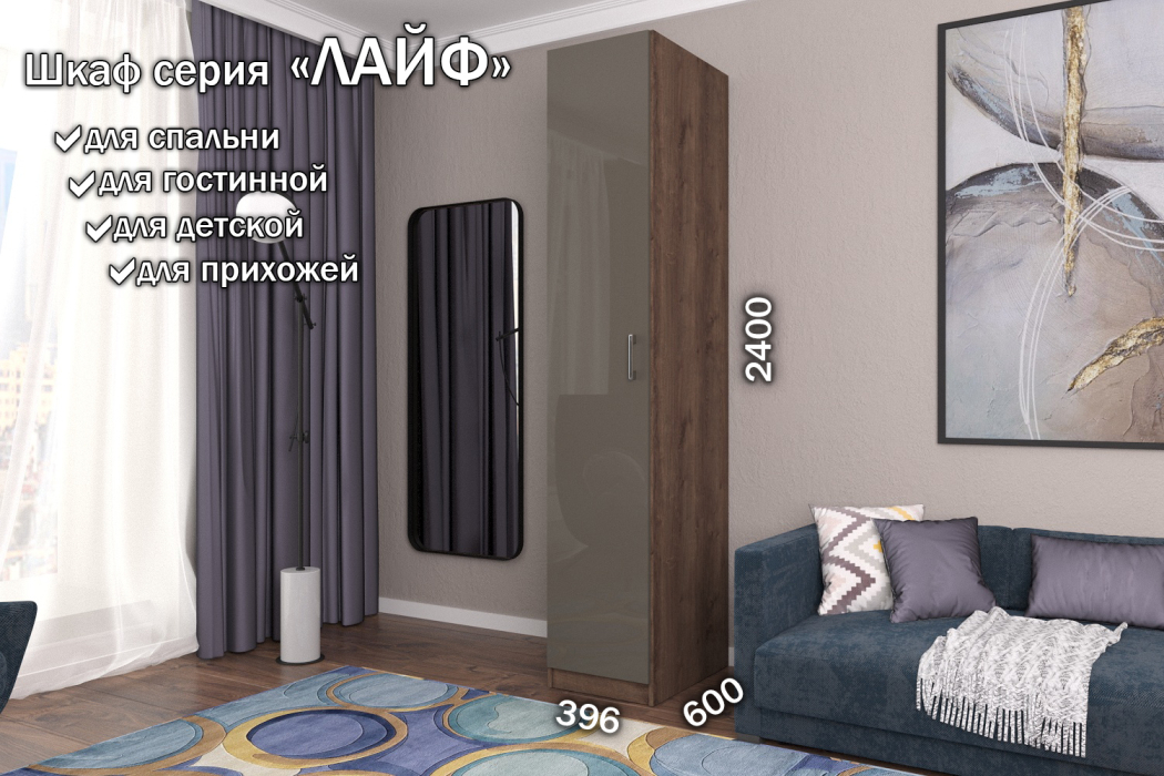 Стильные и удобные корпусные шкафы и наборные корпусные элементы «Лайф» – одно из самых выгодных предложений серийной мебели. Уникальностью данных шкафов, является возможность вносить изменения при сборке. Внутренние детали крепятся на эксцентриках, что позволяет в момент сборки изделия менять секций местами, это дает возможность выбрать максимально удобное расположение. Отличительные особенности шкафов «Лайф» – качественные материалы, удобная комплектация внутреннего наполнения и отличная фурнитура, которая обеспечивает долговечность использования и дает простоту и надежность сборки. Данная серия может комбинироваться в любых четырех цветах на корпус изделия и в любых четырех цветах на фасады изделия на усмотрение и вкус покупателя. Используемые цвета корпуса: Венге, Дуб Сонома, Дуб Экспрессив бронзовый, Северное дерево. Используемые цвета на фасады изделия из материала МДФ Высокий глянец: Белый Бриллиант, Латте, Макиато, Антрацит
