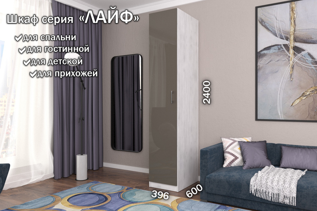 Стильные и удобные корпусные шкафы и наборные корпусные элементы «Лайф» – одно из самых выгодных предложений серийной мебели. Уникальностью данных шкафов, является возможность вносить изменения при сборке. Внутренние детали крепятся на эксцентриках, что позволяет в момент сборки изделия менять секций местами, это дает возможность выбрать максимально удобное расположение. Отличительные особенности шкафов «Лайф» – качественные материалы, удобная комплектация внутреннего наполнения и отличная фурнитура, которая обеспечивает долговечность использования и дает простоту и надежность сборки. Данная серия может комбинироваться в любых четырех цветах на корпус изделия и в любых четырех цветах на фасады изделия на усмотрение и вкус покупателя. Используемые цвета корпуса: Венге, Дуб Сонома, Дуб Экспрессив бронзовый, Северное дерево. Используемые цвета на фасады изделия из материала МДФ Высокий глянец: Белый Бриллиант, Латте, Макиато, Антрацит