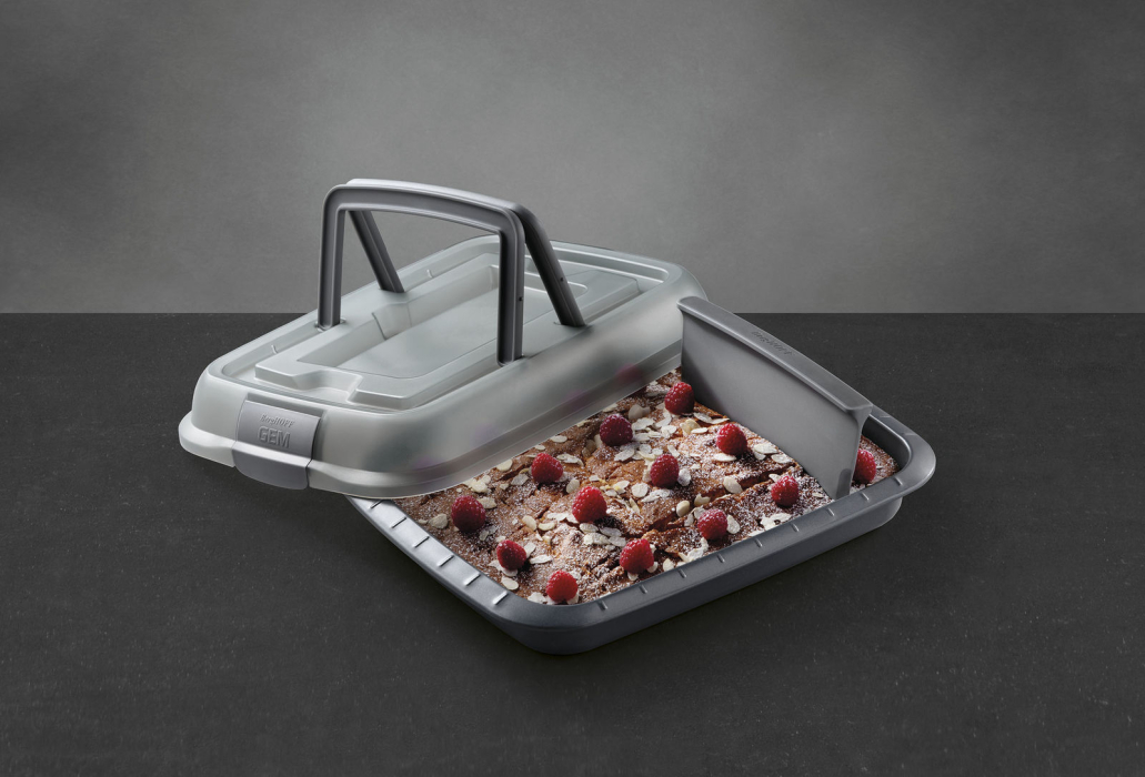 Этот функциональный противень для выпечки выполнен из облегчённой стали с высоким содержанием углерода, что придаёт ему повышенную прочность и предотвратит деформацию. Антипригарное покрытие для удобства извлечения блюда и лёгкой очистки не содержит ни ПФОК, ни кадмия. По краям противня нанесена специальная разметка, чтобы вы могли нарезать идеальные кусочки. Слайсер для разрезания интегрирован в крышку, а сама крышка надёжно защёлкивается и имеет складные ручки. С этой формой в руках вы всегда будете желанным гостем на любом застолье и чаепитии!