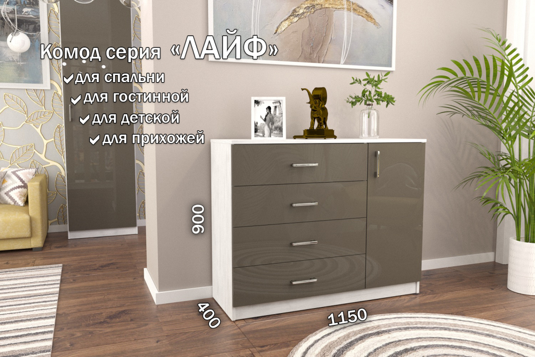 Стильные и удобные корпусные шкафы и наборные корпусные элементы «Лайф» – одно из самых выгодных предложений серийной мебели. Уникальностью данных шкафов, является возможность вносить изменения при сборке. Внутренние детали крепятся на эксцентриках, что позволяет в момент сборки изделия менять секций местами, это дает возможность выбрать максимально удобное расположение. Отличительные особенности шкафов «Лайф» – качественные материалы, удобная комплектация внутреннего наполнения и отличная фурнитура, которая обеспечивает долговечность использования и дает простоту и надежность сборки. Данная серия может комбинироваться в любых четырех цветах на корпус изделия и в любых четырех цветах на фасады изделия на усмотрение и вкус покупателя. Используемые цвета корпуса: Венге, Дуб Сонома, Дуб Экспрессив бронзовый, Северное дерево. Используемые цвета на фасады изделия из материала МДФ Высокий глянец: Белый Бриллиант, Латте, Макиато, Антрацит