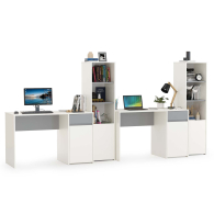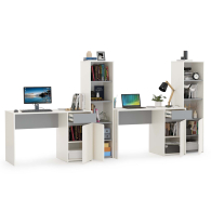 Комплектация включает два однотумбовых стола и два комбинированных стеллажа. Конструктивно каждый стол включает всестительную столешницу и тумбу под ней. Тумба каждого стола имеет удобное распашное отделение с полкой внутри и выдвижным ящиком над ним на шариковых направляющих полного выдвижения. Универсальная сборка - сторону расположения тумбы Вы определяете сами. Стеллаж комбинированный включает - сверху три открытые полки и снизу - полку за распашной дверкой. В комплектации 2 единицы. Универсальная сборка - сторону открывания дверцы стеллажа - Вы определяете сами. Отсутствие лицевой фурнитуры и открывание фасадов за край - не только стилевое, но функциональное решение. Так мебель занимает меньше места и дает возможность проходить вплотную с фасадом без риска зацепиться за ручку или травмироваться. Базовый белый цвет, сочетаясь с акцентным серым, создаёт нейтральную основу интерьера, чтобы подчеркнуть личные вещи и аксессуары. Корпуса и фасады мебели изготовлены из экологически чистой ламинированной ДСП 16 мм, торцы окромлены ПХВ плёнкой 0,4 мм. В производстве молодёжной Торонто использованы качественные материалы и фурнитура - можно разрабатывать проект на весь период обучения. Поставляются письменные столы со стеллажами для двоих детей Торонто № 07 в разобранном виде, надёжно упакованной в гофрокартон, с приложенной подробной инструкцией по сборке.