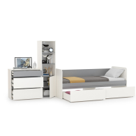 Прелестная кровать с ящиками выполнена в виде диванчика - задняя спинка и скругленные подлокотники из ЛДСП. Спальное место - 800х1900 мм. Основание под матрас (ламинированная древесно-стружечная плита 16 мм.) в комплекте. Матрас 900х2000 мм. для кровати с ящиками Торонто 11.39 приобретается отдельно. Рекомендуемая максимальная высота матраса - 180 мм. В основании кровати оборудованы два выдвижных ящика для постельных принадлежностей и личных вещей ребёнка. Ящики достаточно вместительные и установлены на колесные опоры, что обеспечивает им легкое выдвижение. Стеллаж комбинированный включает - сверху три открытые полки и снизу - полку за распашной дверкой. Универсальная сборка - сторону открывания дверцы стеллажа - Вы определяете сами. Комод состоит из трех выдвижных ящиков на шариковых направляющих полного выдвижения, позволит хранить вещи в полном порядке. Отсутствие лицевой фурнитуры и открывание фасадов за край - не только стилевое, но функциональное решение. Так мебель занимает меньше места и дает возможность проходить вплотную с фасадом без риска зацепиться за ручку или травмироваться. Базовый белый цвет, сочетаясь с акцентным серым, создаёт нейтральную основу интерьера, чтобы подчеркнуть личные вещи и аксессуары. Корпуса и фасады мебели изготовлены из экологически чистой ламинированной ДСП 16 мм, торцы окромлены ПХВ плёнкой 0,4 мм. В производстве молодёжной Торонто использованы качественные материалы и фурнитура - можно разрабатывать проект на весь период обучения. Поставляется кровать 800 с комодом и стеллажом Торонто № 24 в разобранном виде, надёжно упакованной в гофрокартон, с приложенной подробной инструкцией по сборке.